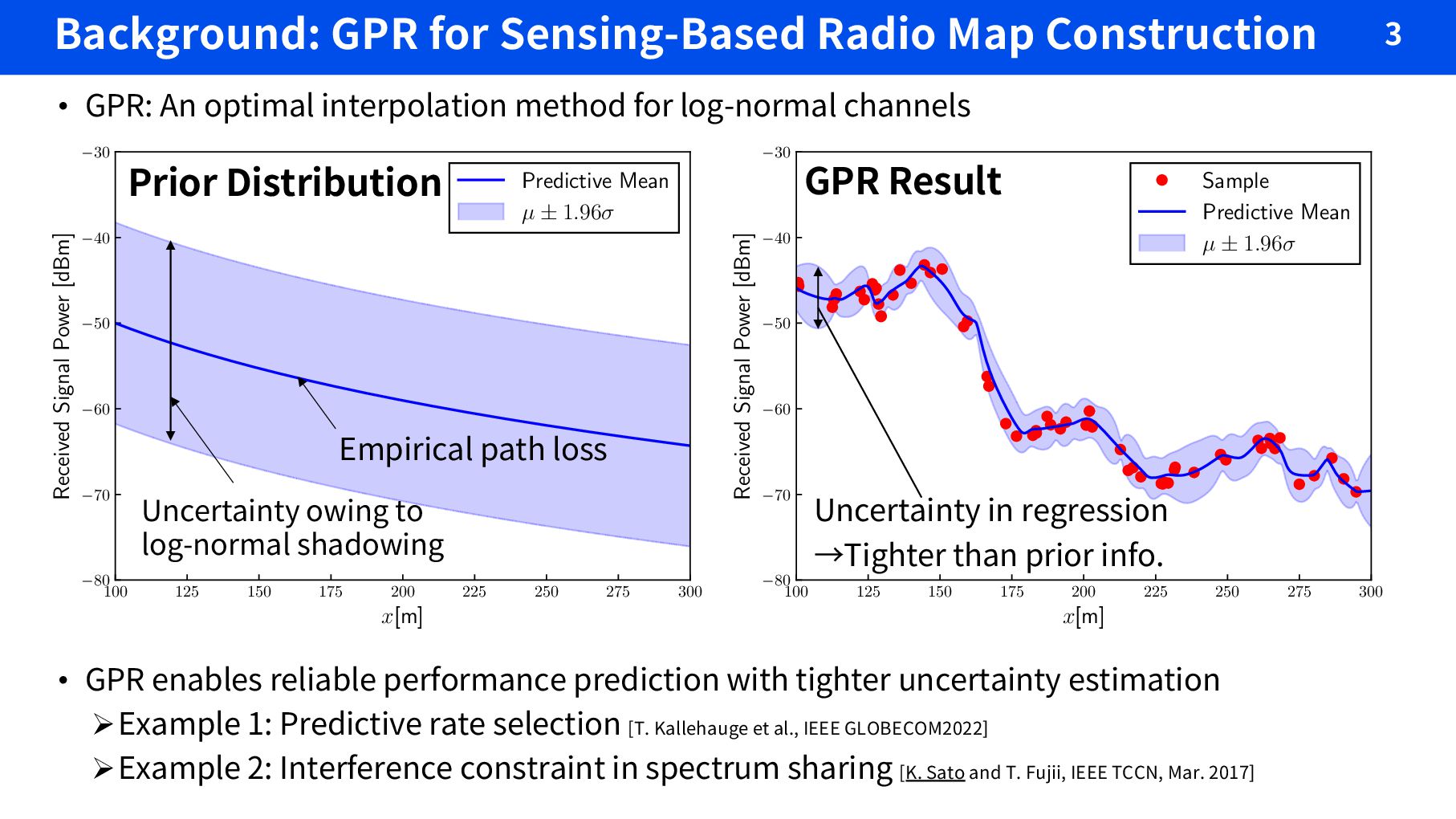 enables reliable performance prediction with tighter uncertainty estimation ØExample 1: Predictive rate selection [T. Kallehauge et al., IEEE GLOBECOM2022] ØExample 2: Interference constraint in spectrum sharing [K. Sato and T. Fujii, IEEE TCCN, Mar. 2017] 100 125 150 175 200 225 250 275 300 x[m] °80 °70 °60 °50 °40 °30 Received Signal Power [dBm] Predictive Mean µ ± 1.96æ Prior Distribution Uncertainty owing to log-normal shadowing 100 125 150 175 200 225 250 275 300 x[m] °80 °70 °60 °50 °40 °30 Received Signal Power [dBm] Sample Predictive Mean µ ± 1.96æ GPR Result Uncertainty in regression →Tighter than prior info. Empirical path loss • GPR: An optimal interpolation method for log-normal channels