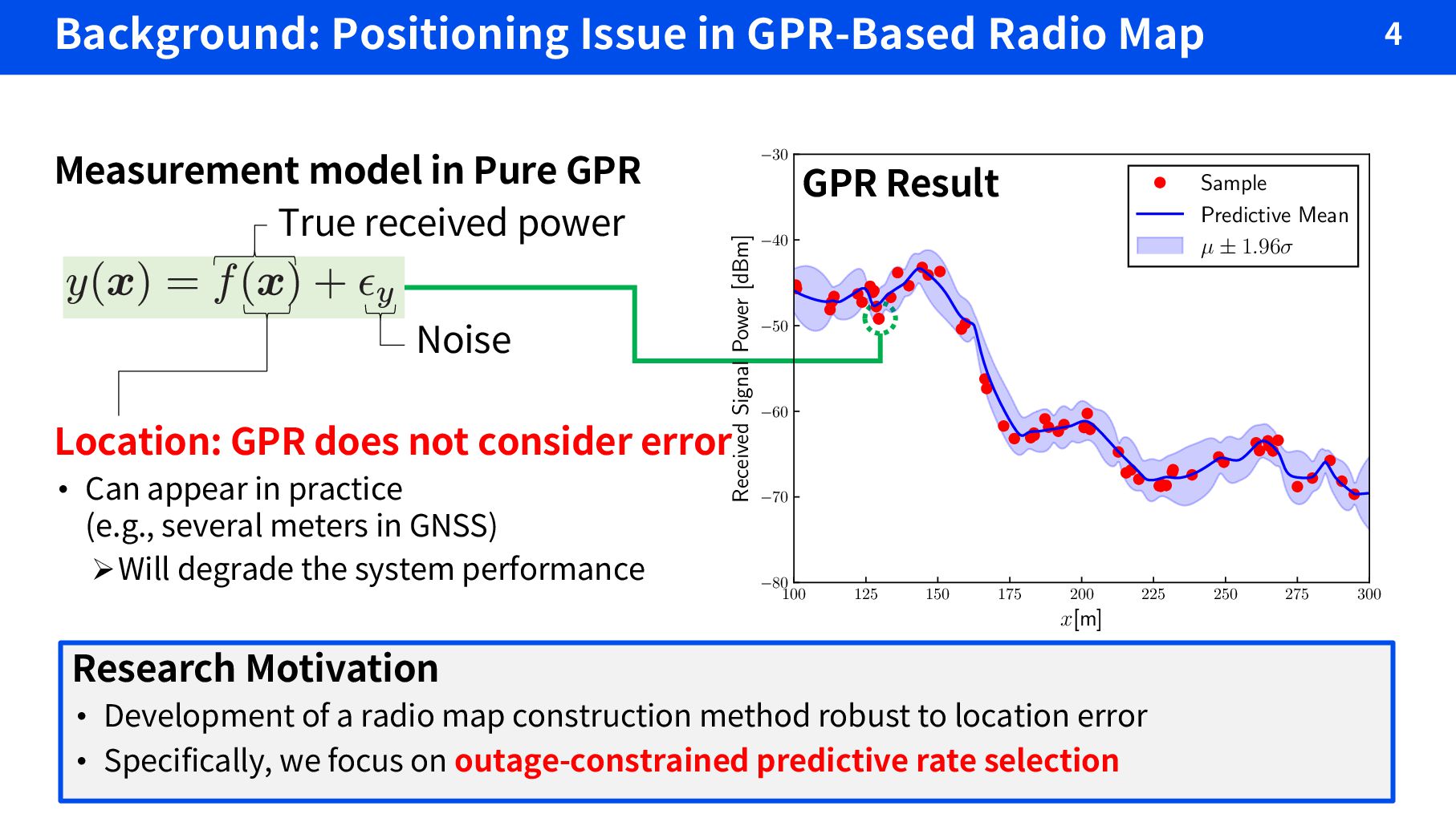 does not consider error • Can appear in practice (e.g., several meters in GNSS) ØWill degrade the system performance Measurement model in Pure GPR True received power Noise Research Motivation • Development of a radio map construction method robust to location error • Specifically, we focus on outage-constrained predictive rate selection 100 125 150 175 200 225 250 275 300 x[m] °80 °70 °60 °50 °40 °30 Received Signal Power [dBm] Sample Predictive Mean µ ± 1.96æ GPR Result