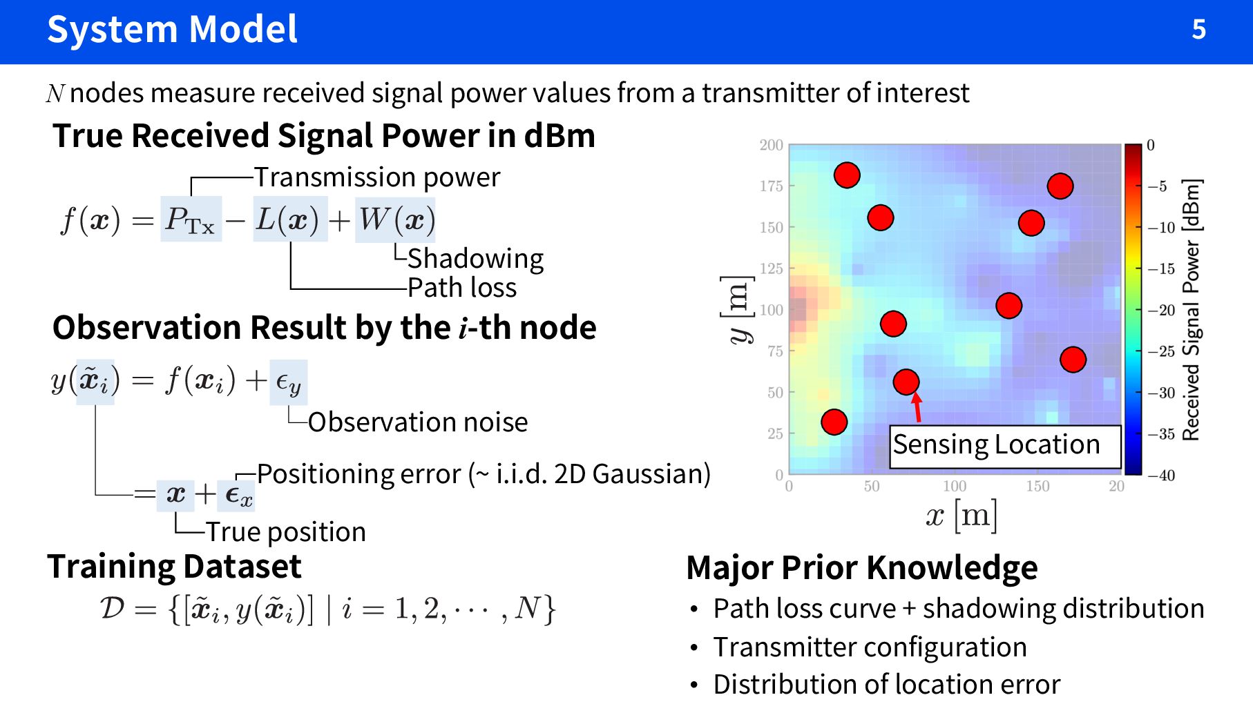 i.i.d. 2D Gaussian) True Received Signal Power in dBm Observation Result by the i-th node N nodes measure received signal power values from a transmitter of interest Transmission power Path loss Shadowing Observation noise Training Dataset Major Prior Knowledge • Path loss curve + shadowing distribution • Transmitter configuration • Distribution of location error