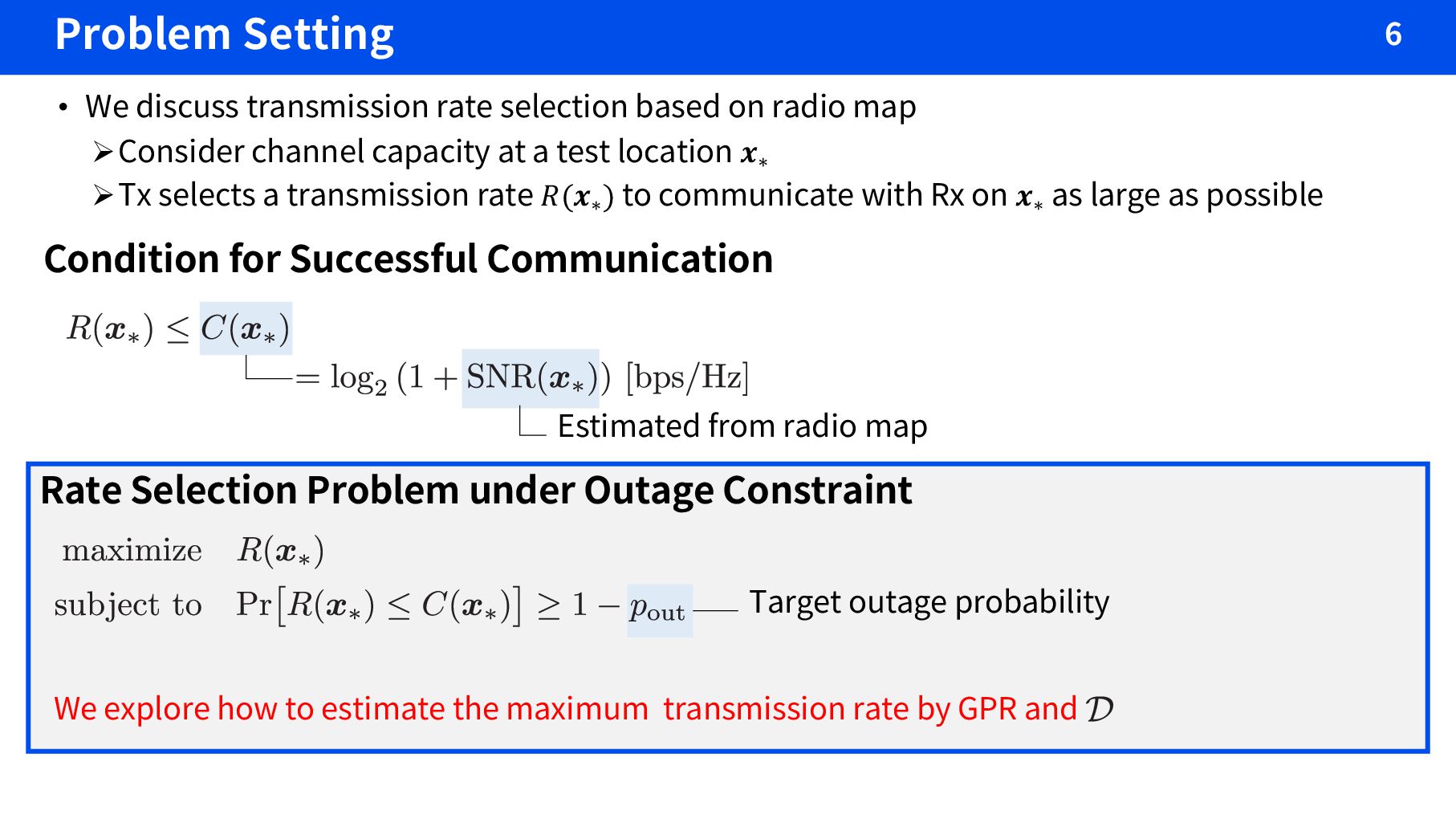 on radio map ØConsider channel capacity at a test location 𝒙∗ ØTx selects a transmission rate 𝑅(𝒙∗ ) to communicate with Rx on 𝒙∗ as large as possible Condition for Successful Communication Rate Selection Problem under Outage Constraint We explore how to estimate the maximum transmission rate by GPR and Target outage probability Estimated from radio map
