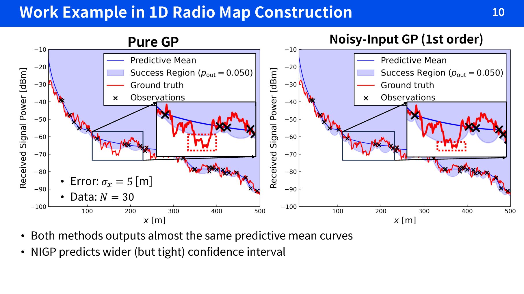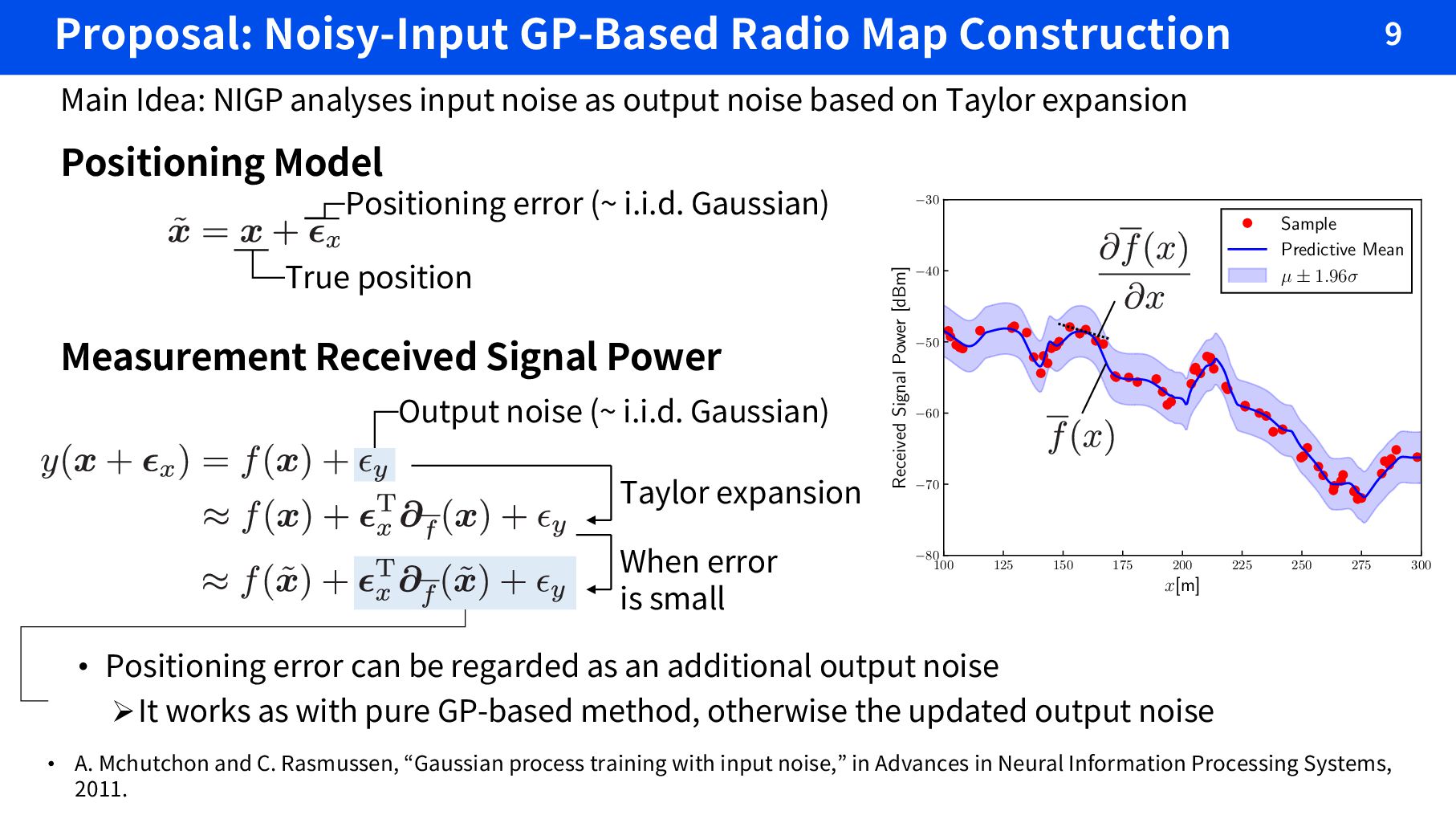 and C. Rasmussen, “Gaussian process training with input noise,” in Advances in Neural Information Processing Systems, 2011. Positioning Model Measurement Received Signal Power True position Positioning error (~ i.i.d. Gaussian) Output noise (~ i.i.d. Gaussian) Main Idea: NIGP analyses input noise as output noise based on Taylor expansion 100 125 150 175 200 225 250 275 300 x[m] °80 °70 °60 °50 °40 °30 Received Signal Power [dBm] Sample Predictive Mean µ ± 1.96æ Taylor expansion • Positioning error can be regarded as an additional output noise ØIt works as with pure GP-based method, otherwise the updated output noise When error is small