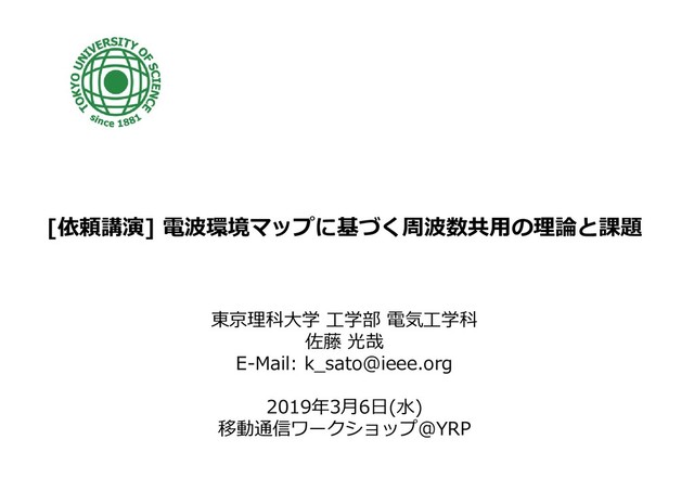 • 電波伝搬 • 無線リソース割り当て • プライバシ 本発表内容の⼀部は以下2つに基づいています(いずれもオープンアクセスです) [1] K. Sato, K. Inage and T. Fujii, “Modeling the Kriging-Aided Spatial Spectrum Sharing over Log-Normal Channels, ” IEEE Wireless Commun. Lett., 2019. [2] K. Sato and T. Fujii, “Kriging-based Interference Power Constraint: Integrated Design of the Radio Environment Map and Transmission Power, ” IEEE Trans. Cogn. Commun. Netw., 2017.