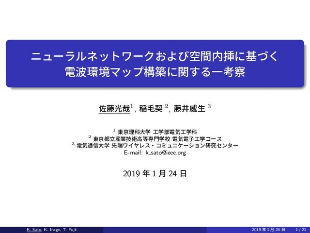 佐藤光哉, 稲毛契, 藤井威生, "ニューラルネットワークおよび空間内挿に基づく電波環境マップ構築に関する一考察, " 信学技報, SR2018-106, pp.63-70, 2019年1月.