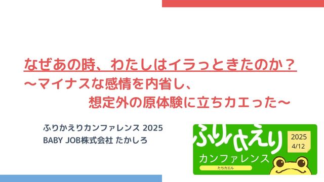 なぜあの時、わたしはイラっときたのか? 〜マイナスな感情を内省し、 想定外の原体験に立ちカエった〜 ふりかえりカンファレンス 2025 BABY JOB株式会社 たかしろ