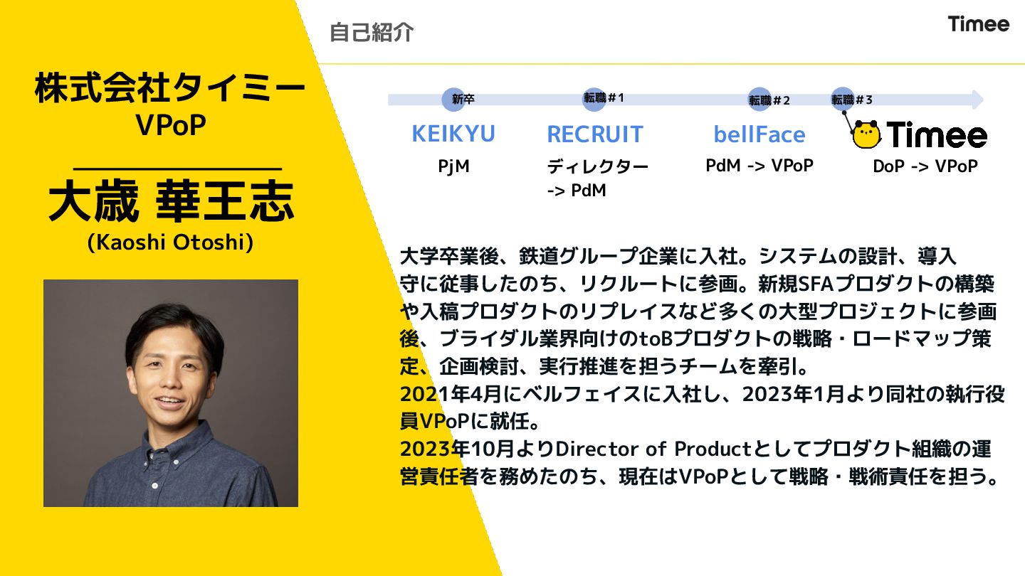 株式会社タイミー VPoP 大歳 華王志 (Kaoshi Otoshi) 自己紹介 大学卒業後、鉄道グループ企業に入社。システムの設計、導入、保 守に従事したのち、リクルートに参画。新規SFAプロダクトの構築 や入稿プロダクトのリプレイスなど多くの大型プロジェクトに参画