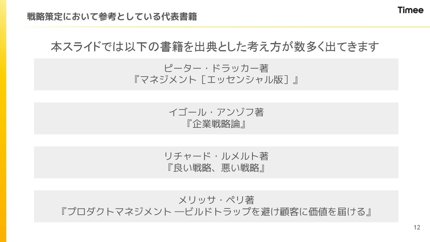 本スライドでは以下の書籍を出典とした考え方が数多く出てきます 12 ピーター・ドラッカー著 『マネジメント[エッセンシャル版]』 メリッサ・ペリ著 『プロダクトマネジメント ―ビルドトラップを避け顧客に価値を届ける』 リチャード・ルメルト著 『良い戦略、悪い戦略』 イゴール・アンゾフ著