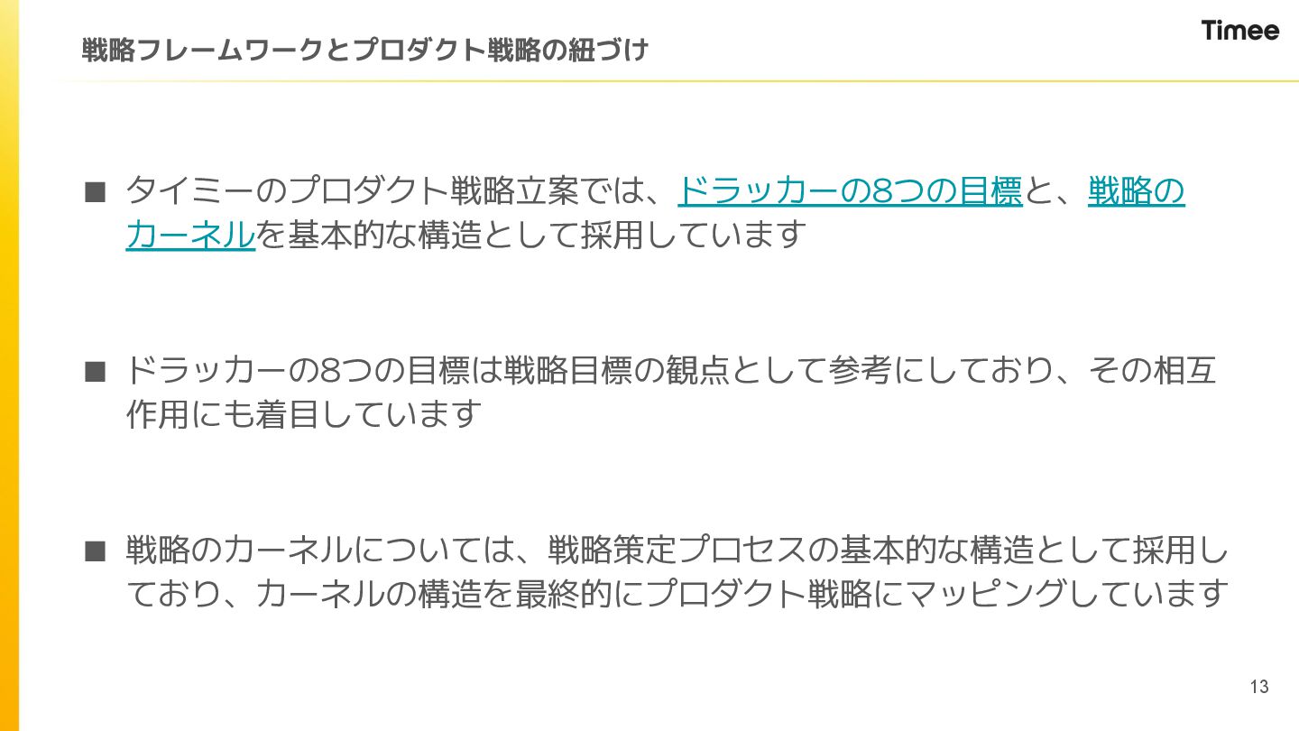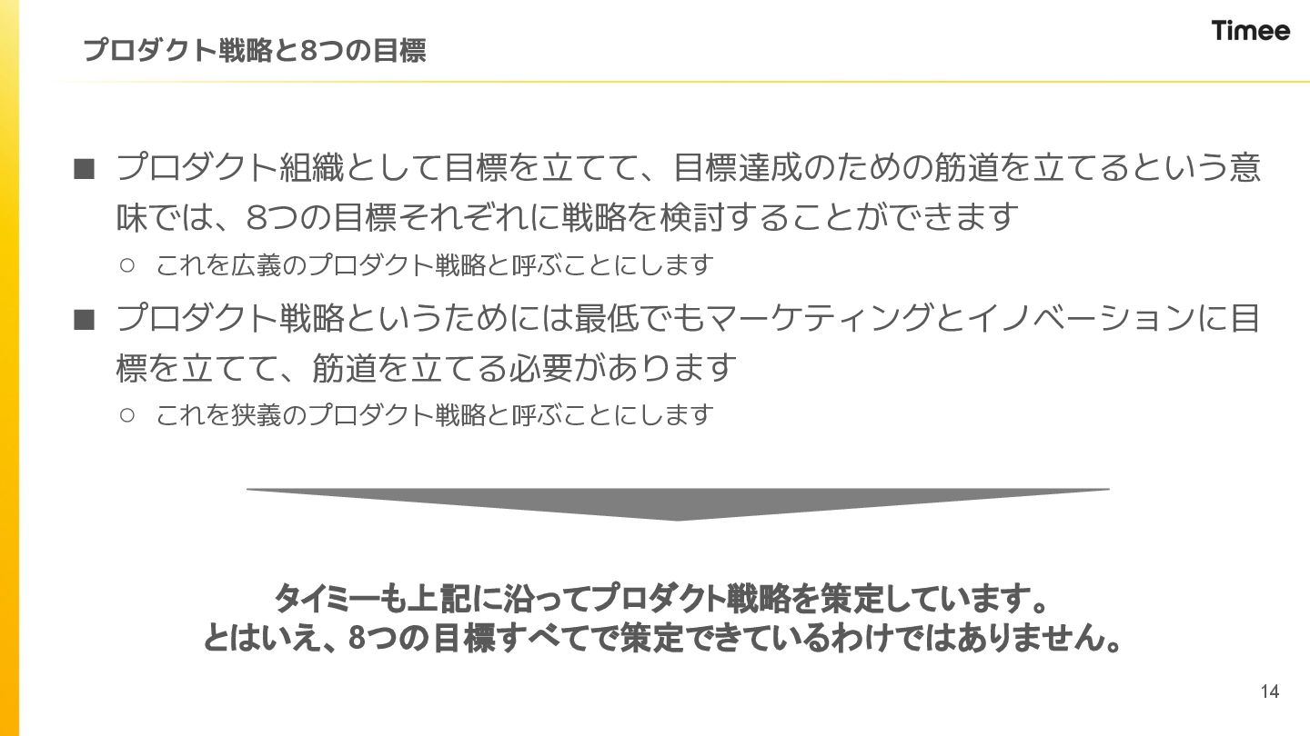 13 ▪ タイミーのプロダクト戦略立案では、ドラッカーの8つの目標と、戦略の カーネルを基本的な構造として採用しています ▪ ドラッカーの8つの目標は戦略目標の観点として参考にしており、その相互 作用にも着目しています ▪ 戦略のカーネルについては、戦略策定プロセスの基本的な構造として採用し ており、カーネルの構造を最終的にプロダクト戦略にマッピングしています