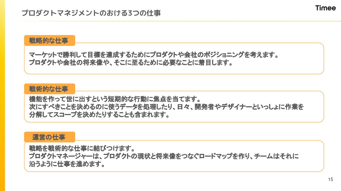 戦略を戦術的な仕事に結びつけます。 プロダクトマネージャーは、プロダクトの現状と将来像をつなぐロードマップを作り、チームはそれに 沿うように仕事を進めます。 機能を作って世に出すという短期的な行動に焦点を当てます。 次にすべきことを決めるのに使うデータを処理したり、日々、開発者やデザイナーといっしょに作業を 分解してスコープを決めたりすることも含まれます。 15 プロダクトマネジメントのおける3つの仕事 戦術的な仕事 運営の仕事