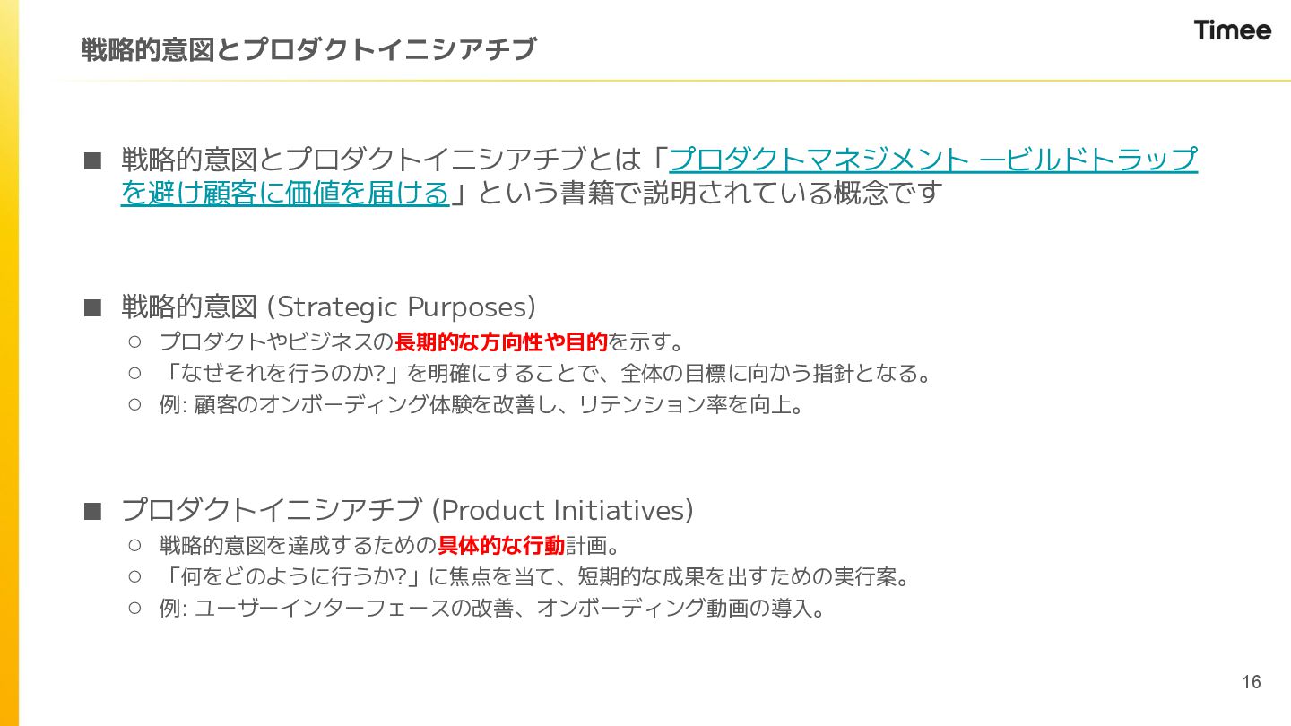 16 ▪ 戦略的意図とプロダクトイニシアチブとは「プロダクトマネジメント ―ビルドトラップ を避け顧客に価値を届ける」という書籍で説明されている概念です ▪ 戦略的意図 (Strategic Purposes) ◦