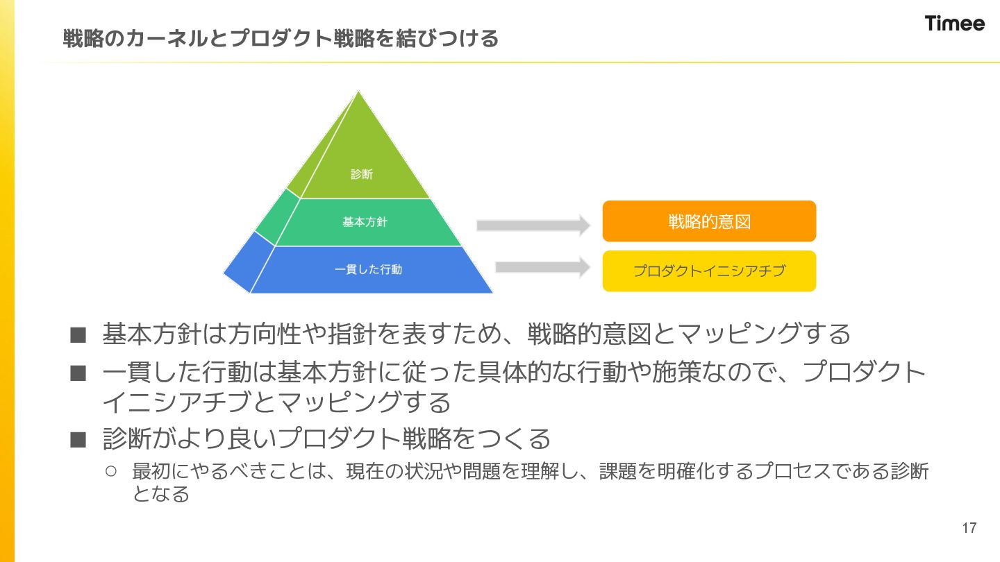 17 ▪ 基本方針は方向性や指針を表すため、戦略的意図とマッピングする ▪ 一貫した行動は基本方針に従った具体的な行動や施策なので、プロダクト イニシアチブとマッピングする ▪ 診断がより良いプロダクト戦略をつくる ◦ 最初にやるべきことは、現在の状況や問題を理解し、課題を明確化するプロセスである診断