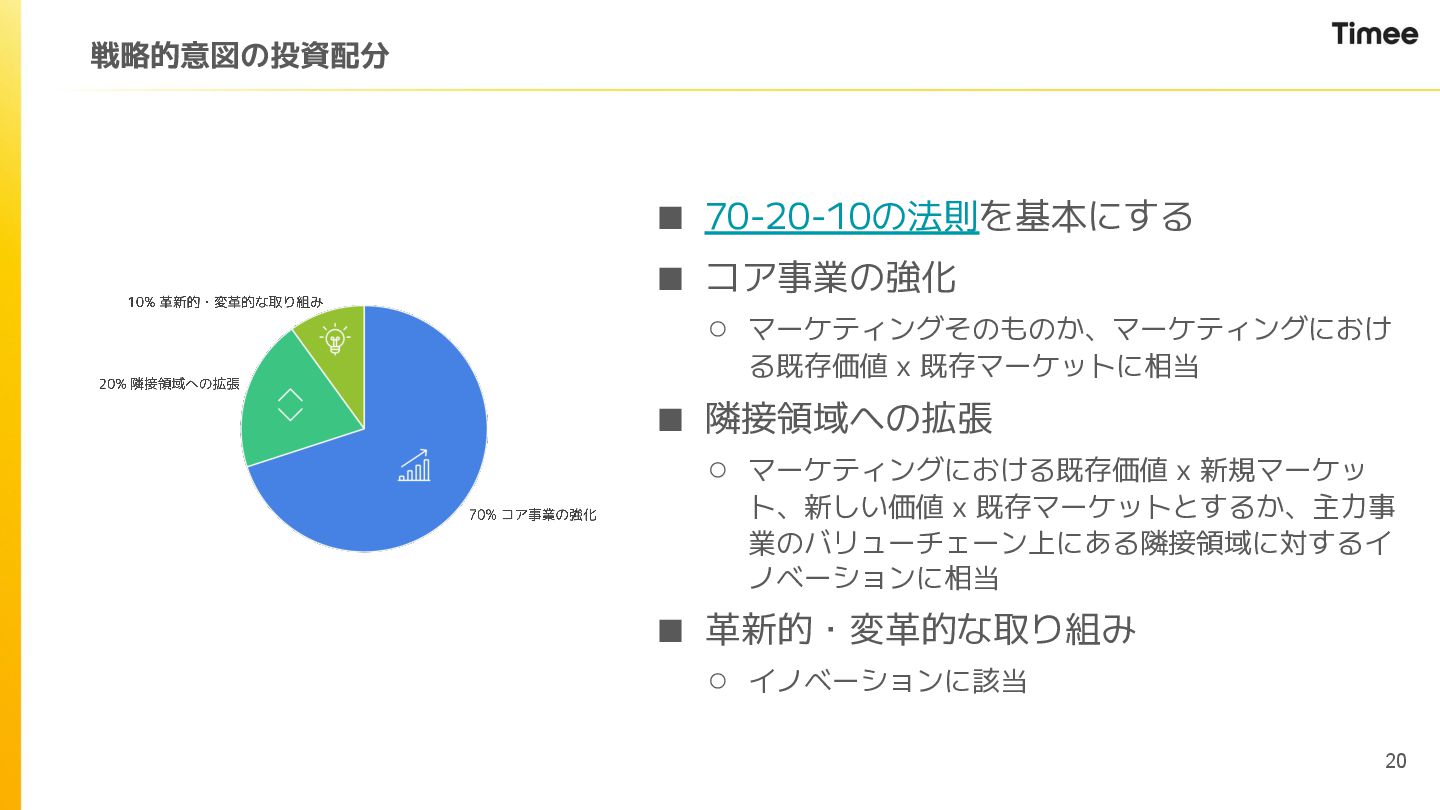 20 ▪ 70-20-10の法則を基本にする ▪ コア事業の強化 ◦ マーケティングそのものか、マーケティングにおけ る既存価値 x 既存マーケットに相当