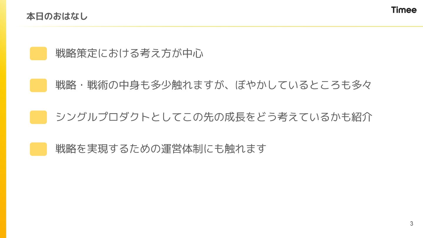 3 本日のおはなし 戦略策定における考え方が中心 戦略・戦術の中身も多少触れますが、ぼやかしているところも多々 シングルプロダクトとしてこの先の成長をどう考えているかも紹介 戦略を実現するための運営体制にも触れます