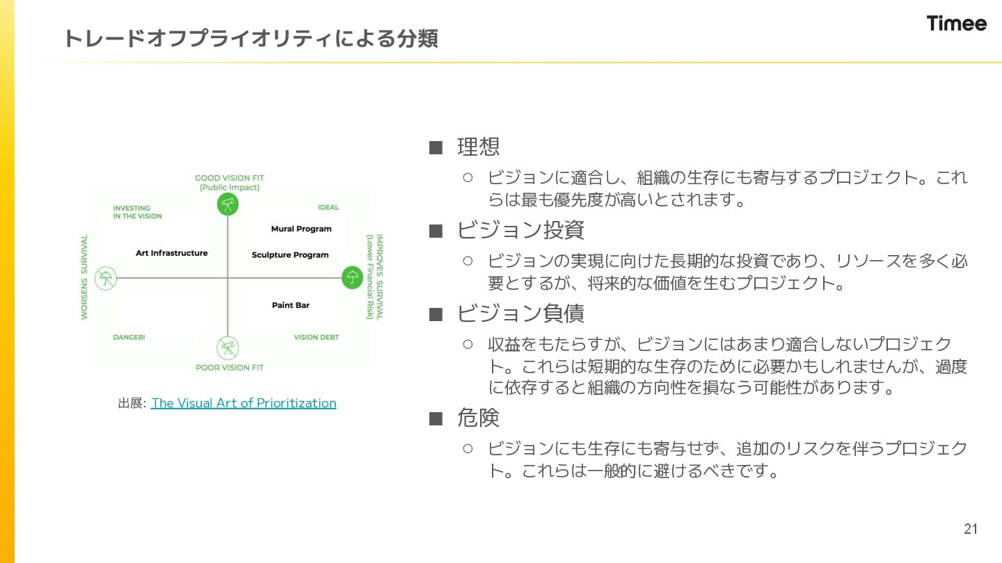 要とするが、将来的な価値を生むプロジェクト。 ▪ ビジョン負債 ◦ 収益をもたらすが、ビジョンにはあまり適合しないプロジェク ト。これらは短期的な生存のために必要かもしれませんが、過度 に依存すると組織の方向性を損なう可能性があります。 ▪ 危険 ◦ ビジョンにも生存にも寄与せず、追加のリスクを伴うプロジェク ト。これらは一般的に避けるべきです。 出展: The Visual Art of Prioritization トレードオフプライオリティによる分類