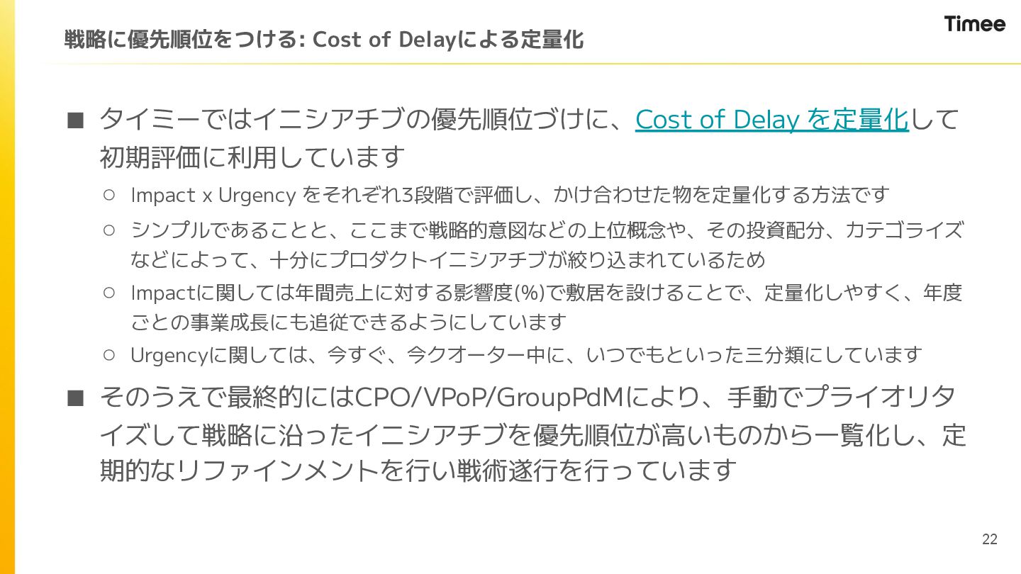 22 ▪ タイミーではイニシアチブの優先順位づけに、Cost of Delay を定量化して 初期評価に利用しています ◦ Impact x