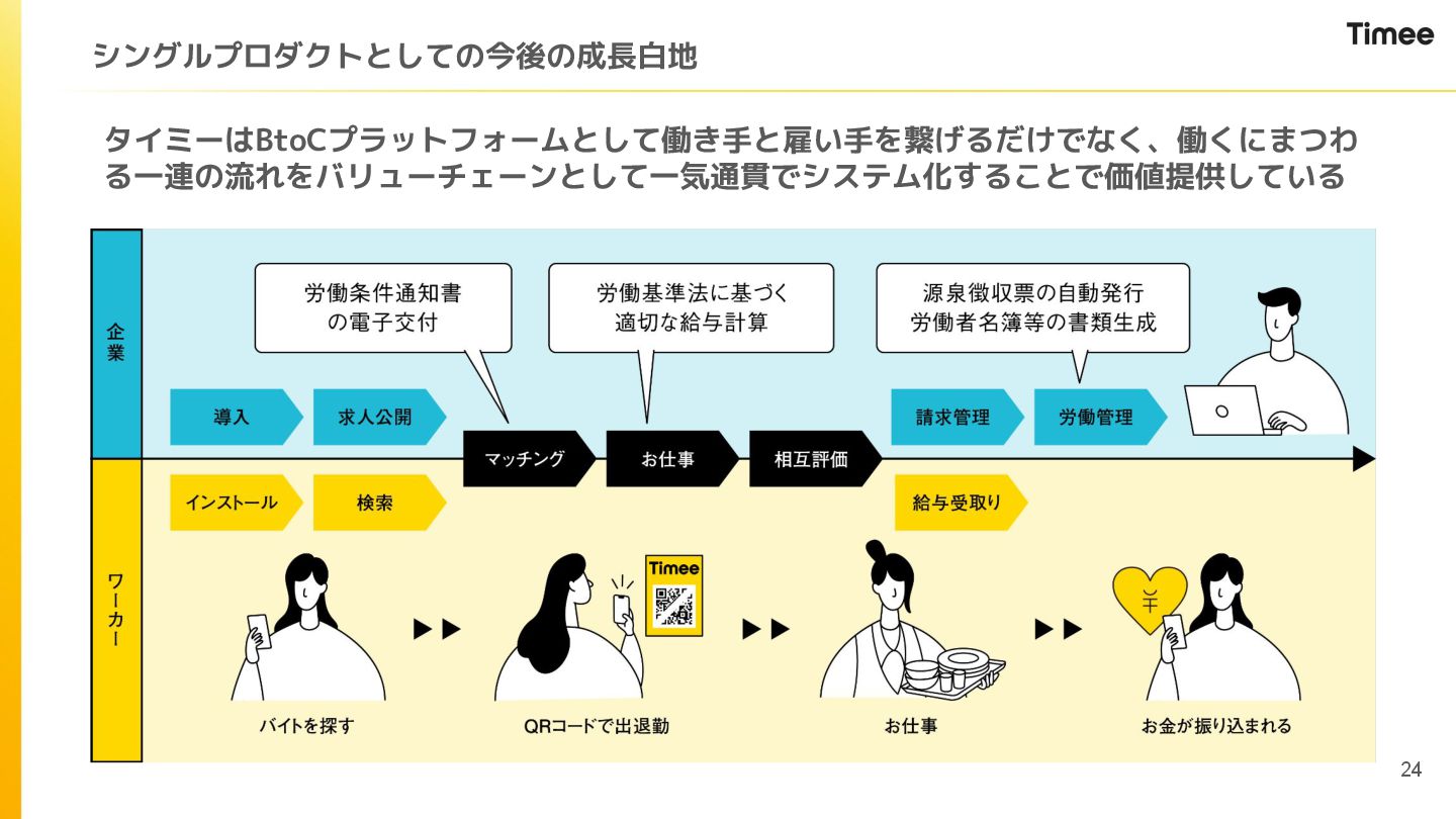 24 シングルプロダクトとしての今後の成長白地 タイミーはBtoCプラットフォームとして働き手と雇い手を繋げるだけでなく、働くにまつわ る一連の流れをバリューチェーンとして一気通貫でシステム化することで価値提供している