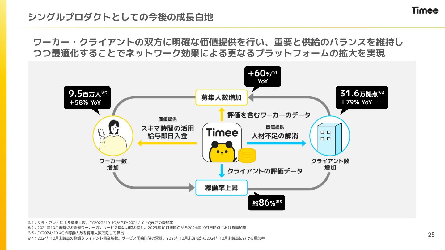 シングルプロダクトとしての今後の成長白地 ワーカー・クライアントの双方に明確な価値提供を行い、重要と供給のバランスを維持し つつ最適化することでネットワーク効果による更なるプラットフォームの拡大を実現 ※1:クライアントによる募集人数。FY2023/10 4QからFY2024/10 4Qまでの増加率 ※2:2024年10月末時点の登録ワーカー数。サービス開始以降の累計。2023年10月末時点から2024年10月末時点における増加率 ※3:FY2024/10 4Qの稼働人数を募集人数で除して算出 ※4:2024年10月末時点の登録クライアント事業所数。サービス開始以降の累計。2023年10月末時点から2024年10月末時点における増加率