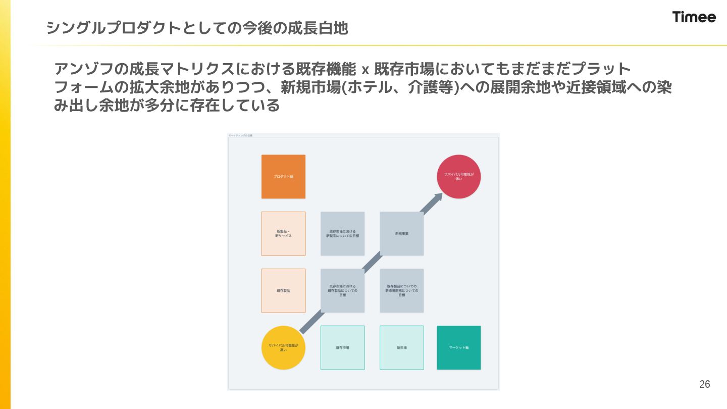 26 シングルプロダクトとしての今後の成長白地 アンゾフの成長マトリクスにおける既存機能 x 既存市場においてもまだまだプラット フォームの拡大余地がありつつ、新規市場(ホテル、介護等)への展開余地や近接領域への染 み出し余地が多分に存在している