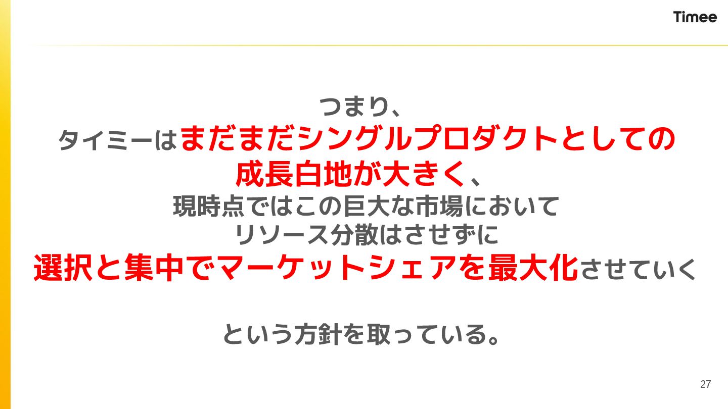 27 つまり、 タイミーはまだまだシングルプロダクトとしての 成長白地が大きく、 現時点ではこの巨大な市場において リソース分散はさせずに 選択と集中でマーケットシェアを最大化させていく という方針を取っている。