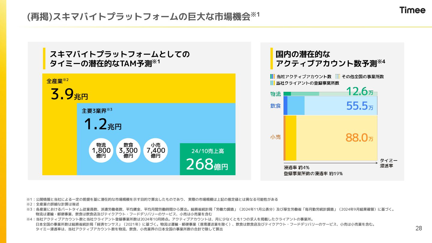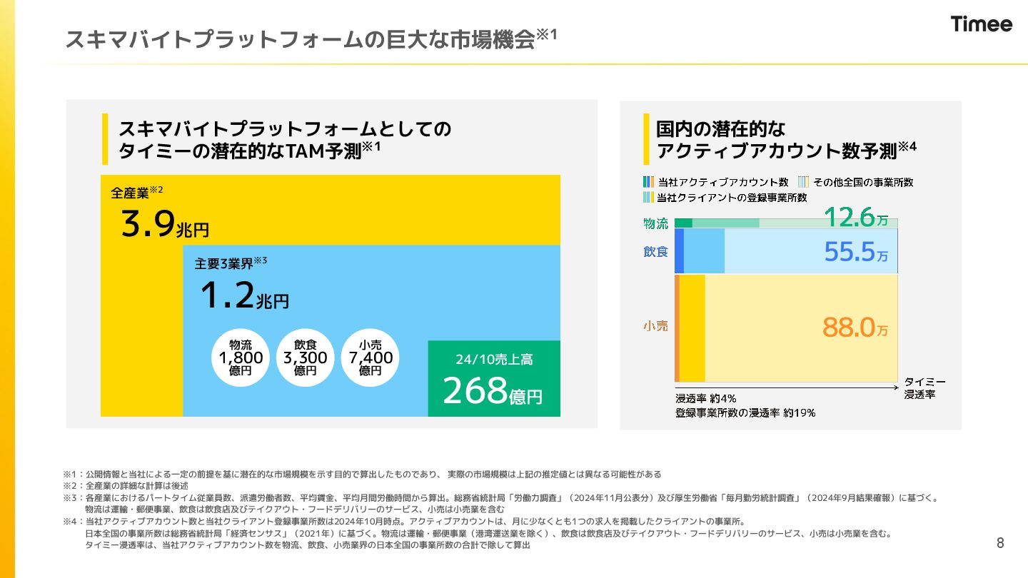物流は運輸・郵便事業、飲食は飲食店及びテイクアウト・フードデリバリーのサービス、小売は小売業を含む ※4:当社アクティブアカウント数と当社クライアント登録事業所数は2024年10月時点。アクティブアカウントは、月に少なくとも1つの求人を掲載したクライアントの事業所。 日本全国の事業所数は総務省統計局「経済センサス」(2021年)に基づく。物流は運輸・郵便事業(港湾運送業を除く)、飲食は飲食店及びテイクアウト・フードデリバリーのサービス、小売は小売業を含む。 タイミー浸透率は、当社アクティブアカウント数を物流、飲食、小売業界の日本全国の事業所数の合計で除して算出 3.9兆円 1.2兆円 全産業※2 主要3業界※3 物流 1,800 億円 飲食 3,300 億円 小売 7,400 億円 268億円 24/10売上高