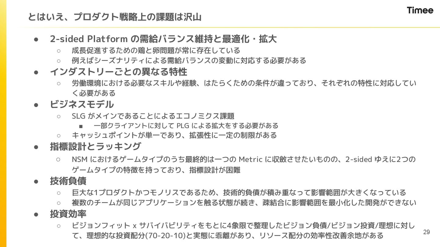 • インダストリーごとの異なる特性 ◦ 労働環境における必要なスキルや経験、はたらくための条件が違っており、それぞれの特性に対応してい く必要がある • ビジネスモデル ◦ SLG がメインであることによるエコノミクス課題 ▪ 一部クライアントに対して PLG による拡大をする必要がある ◦ キャッシュポイントが単一であり、拡張性に一定の制限がある • 指標設計とラッキング ◦ NSM におけるゲームタイプのうち最終的は一つの Metric に収斂させたいものの、2-sided ゆえに2つの ゲームタイプの特徴を持っており、指標設計が困難 • 技術負債 ◦ 巨大な1プロダクトかつモノリスであるため、技術的負債が積み重なって影響範囲が大きくなっている ◦ 複数のチームが同じアプリケーションを触る状態が続き、疎結合に影響範囲を最小化した開発ができない • 投資効率 ◦ ビジョンフィット x サバイバビリティをもとに4象限で整理したビジョン負債/ビジョン投資/理想に対し て、理想的な投資配分(70-20-10)と実態に乖離があり、リソース配分の効率性改善余地がある