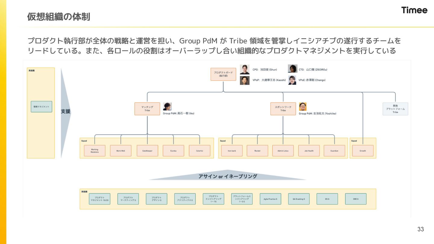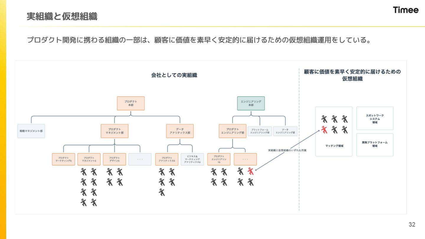 32 実組織と仮想組織 プロダクト開発に携わる組織の一部は、顧客に価値を素早く安定的に届けるための仮想組織運用をしている。