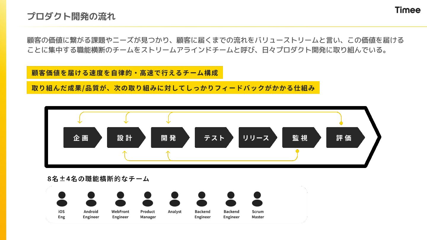 プロダクト開発の流れ 顧客の価値に繋がる課題やニーズが見つかり、顧客に届くまでの流れをバリューストリームと言い、この価値を届ける ことに集中する職能横断のチームをストリームアラインドチームと呼び、日々プロダクト開発に取り組んでいる。