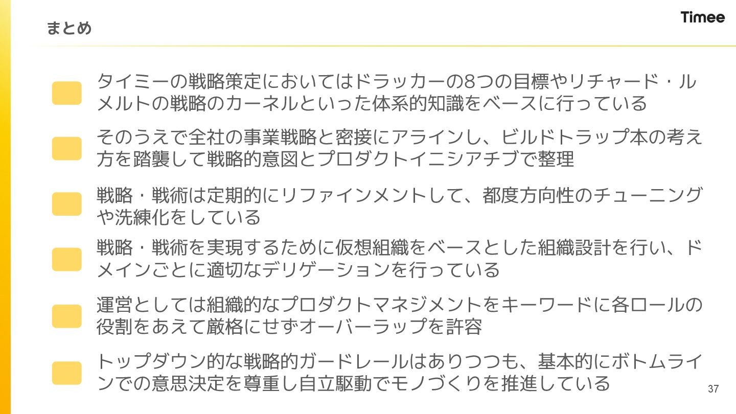 37 まとめ タイミーの戦略策定においてはドラッカーの8つの目標やリチャード・ル メルトの戦略のカーネルといった体系的知識をベースに行っている そのうえで全社の事業戦略と密接にアラインし、ビルドトラップ本の考え 方を踏襲して戦略的意図とプロダクトイニシアチブで整理 戦略・戦術は定期的にリファインメントして、都度方向性のチューニング や洗練化をしている 戦略・戦術を実現するために仮想組織をベースとした組織設計を行い、ド メインごとに適切なデリゲーションを行っている