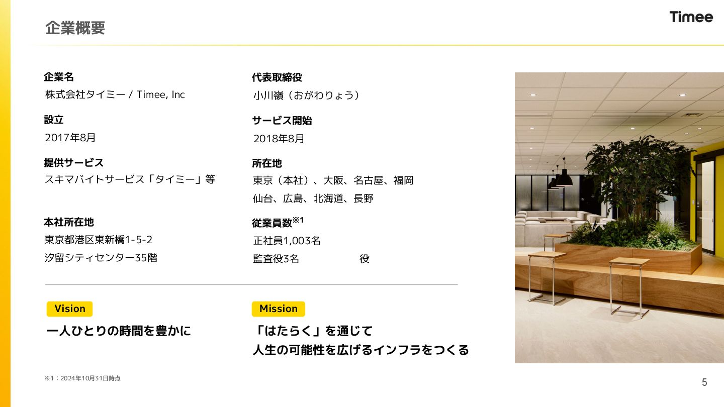 スキマバイトサービス「タイミー」等 2017年8月 東京都港区東新橋1-5-2 汐留シティセンター35階 代表取締役 サービス開始 所在地 従業員数※1 小川嶺(おがわりょう) 東京(本社)、大阪、名古屋、福岡 仙台、広島、北海道、長野 2018年8月 正社員1,003名、及び取締役4名 監査役3名、アルバイト220名 Vision Mission 一人ひとりの時間を豊かに 「はたらく」を通じて 人生の可能性を広げるインフラをつくる ※1:2024年10月31日時点
