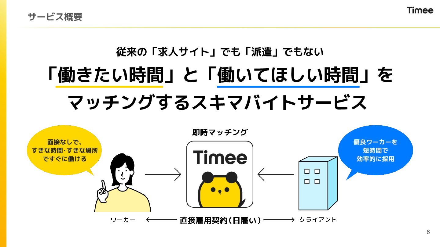 5 企業概要 企業名 設立 提供サービス 本社所在地 株式会社タイミー / Timee, Inc