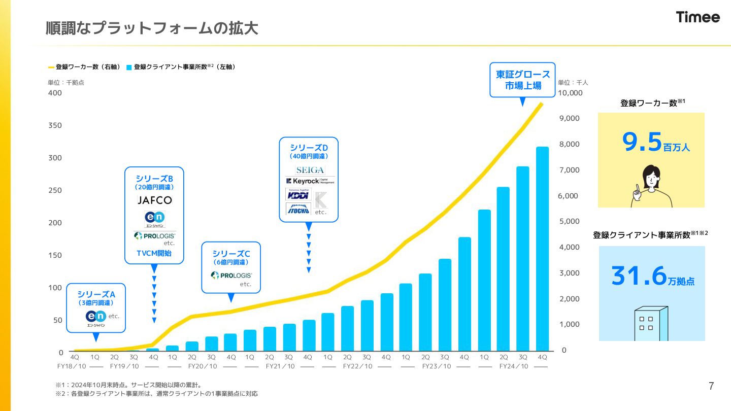 1Q 2Q 3Q 4Q 1Q 2Q 3Q 4Q 4Q 1Q 2Q 3Q 4Q 1Q 2Q 3Q 4Q 1Q 2Q 3Q 4Q 1Q 2Q 3Q 4Q FY20/10 FY21/10 FY22/10 FY23/10 FY24/10 FY19/10 FY18/10 400 300 200 100 0 150 50 250 350 6,000 10,000 9,000 8,000 7,000 5,000 4,000 3,000 2,000 1,000 0 シリーズC (6億円調達) 東証グロース 市場上場 登録ワーカー数(右軸) 登録クライアント事業所数※2(左軸) 単位:千拠点 単位:千人 シリーズB (20億円調達) TVCM開始 etc. etc. シリーズA (3億円調達) etc. シリーズD (40億円調達) etc.