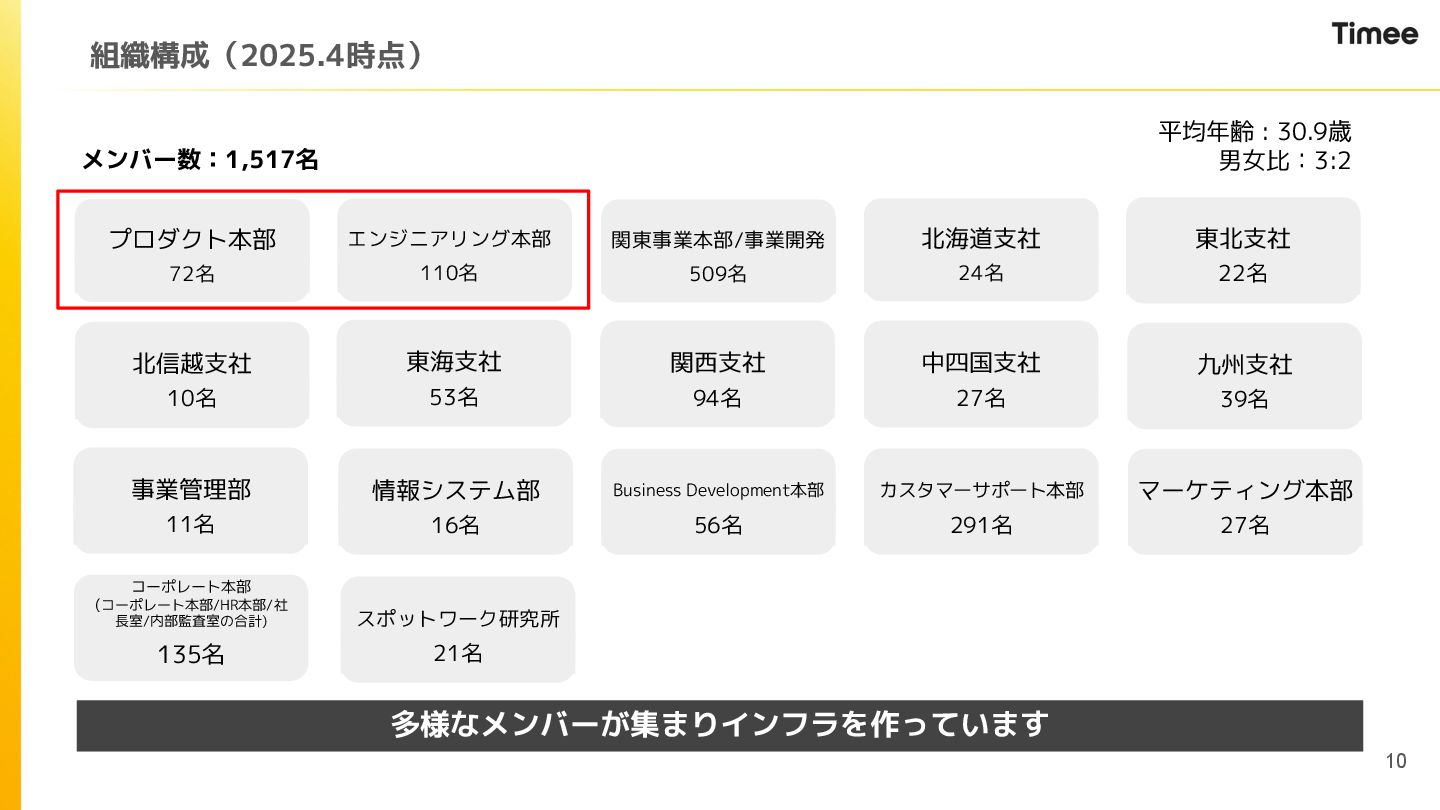 事業管理部 11名 東海支社 53名 関西支社 94名 東北支社 22名 中四国支社 27名 カスタマーサポート本部 291名 コーポレート本部 (コーポレート本部/HR本部/社 長室/内部監査室の合計) 135名 マーケティング本部 27名 21名 スポットワーク研究所 プロダクト本部 72名 北海道支社 24名 エンジニアリング本部 110名 関東事業本部/事業開発 509名 Business Development本部 56名 北信越支社 10名 情報システム部 16名