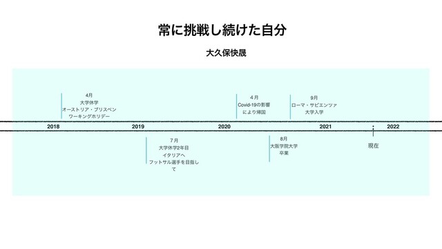 ɹ ɹɹɹɹɹ 2021ɹɹɹɹɹɹɹɾɹɹ2022ɹɹ 4݄ɹ େֶٳֶ ΦʔετϦΞɾϒϦεϕϯ ϫʔΩϯάϗϦσʔ ݄̓ɹ େֶٳֶ2 ΠλϦΞ ϑοταϧબखΛࢦ͠ ͯ ݄̐ɹ Covid-19ͷӨڹ ʹΑΓؼࠃ 9݄ɹ ϩʔϚɾαϐΤϯπΝ େֶೖֶ 8݄ େࡕֶӃେֶ ଔۀ ݱࡏ