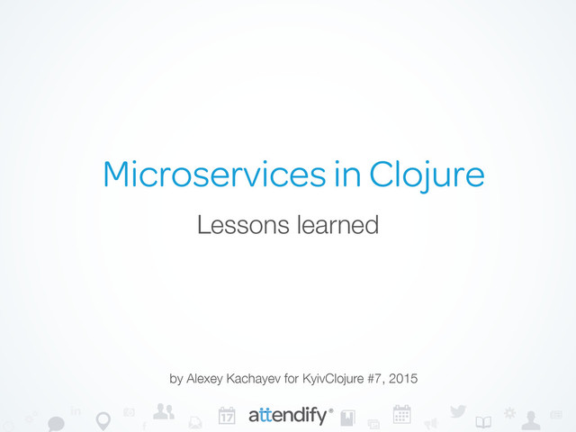 of 23) ‣ 82 RPC endpoints in Clojure (from a total of 290+) ‣ 17k+ LOC of Clojure code, 2850+ commits ‣ 4-6M requests handled each day ‣ 3 engineers work with Clojure on a regular basis ‣ Not only Clojure company (also Erlang, Scala, Go)