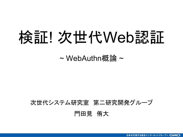 次世代システム研究室 第二研究開発グループ 門田見 侑大 検証! 次世代Web認証 ~ WebAuthn概論 ~