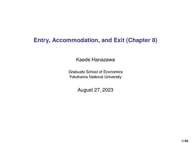 be indifferent, the expected profits from the two actions must be the same. • If both firms are still in the market at date t, each firm drops out with probability: xdt (between t and t+dt), where x ≡ rf ˜ Πm − f . • Firm 1 is indifferent between dropping out at date t and staying until t + dt if 0 = −fdt + (xdt) [ ˜ Πm − f r ] + 0. • Each firm drops out according to a Poisson process with parameter x. • The equilibrium is not unique. 16 / 36