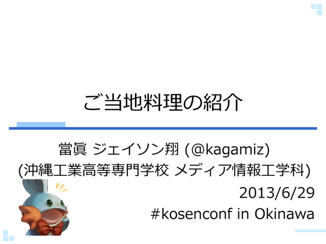 ご当地料理の紹介 當眞 ジェイソン翔 (@kagamiz) (沖縄工業高等専門学校 メディア情報工学科) 2013/6/29 #kosenconf in Okinawa
