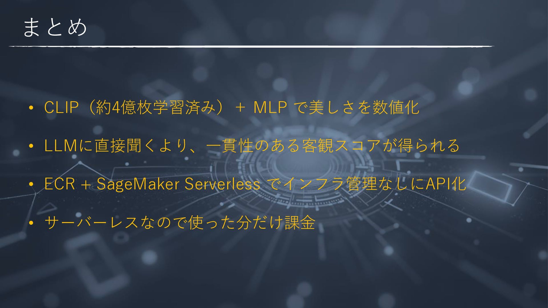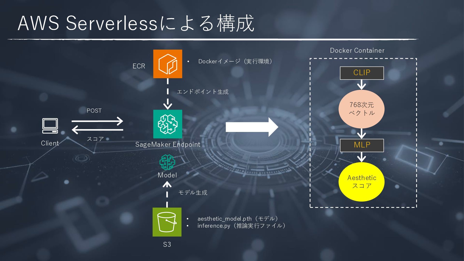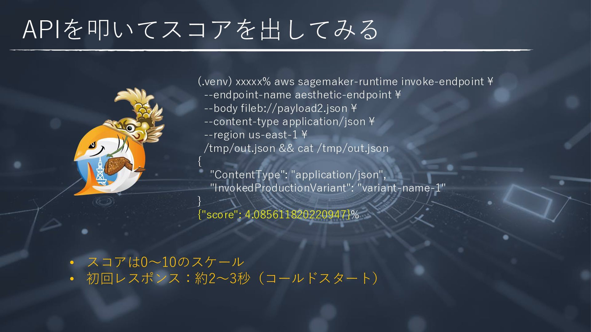 --body fileb://payload2.json ¥ --content-type application/json ¥ --region us-east-1 ¥ /tmp/out.json && cat /tmp/out.json { "ContentType": "application/json", "InvokedProductionVariant": "variant-name-1" } {"score": 4.085611820220947}% • スコアは0〜10のスケール • 初回レスポンス:約2〜3秒(コールドスタート)