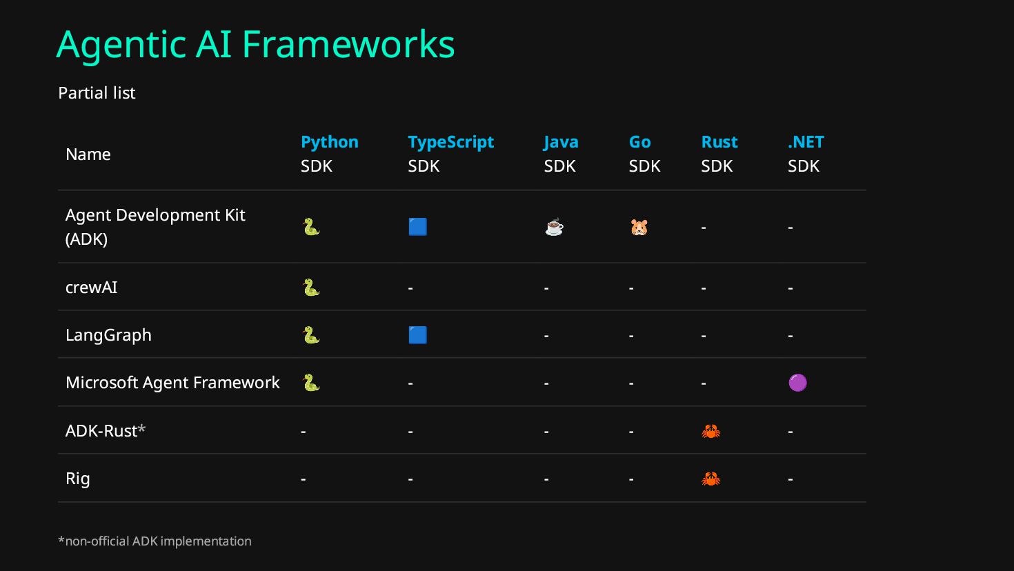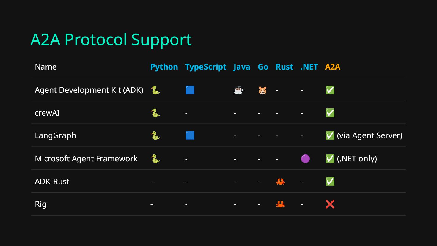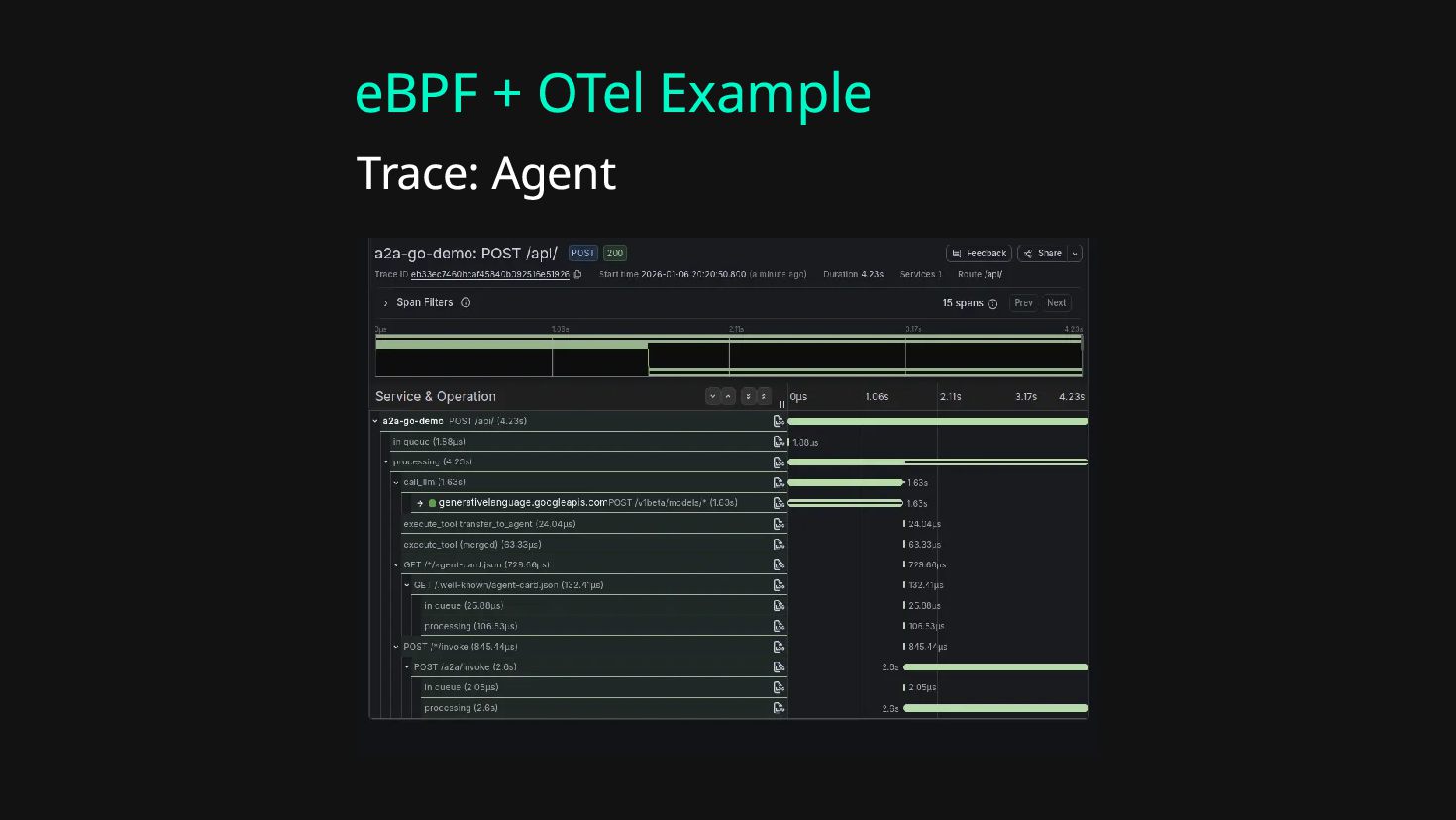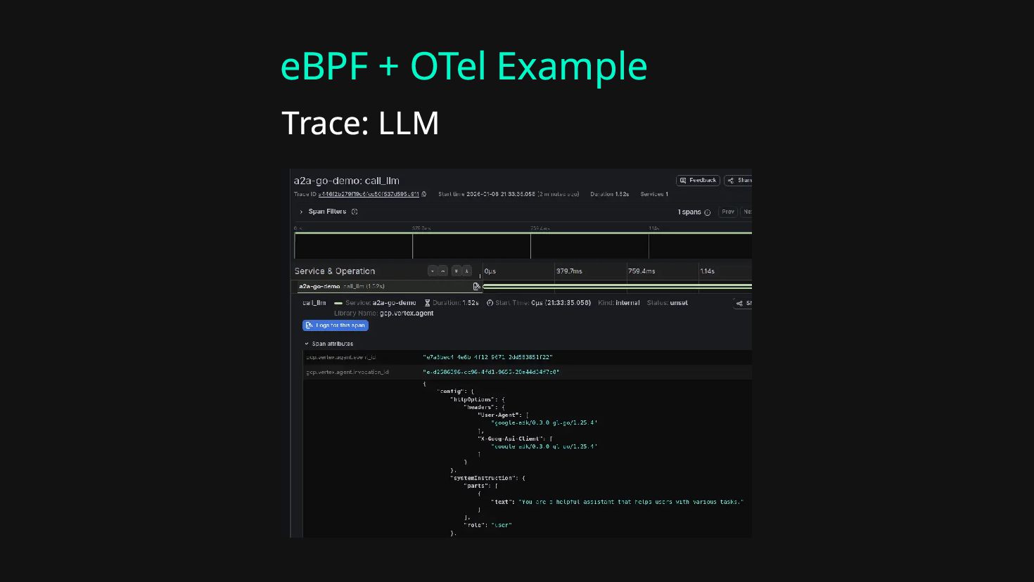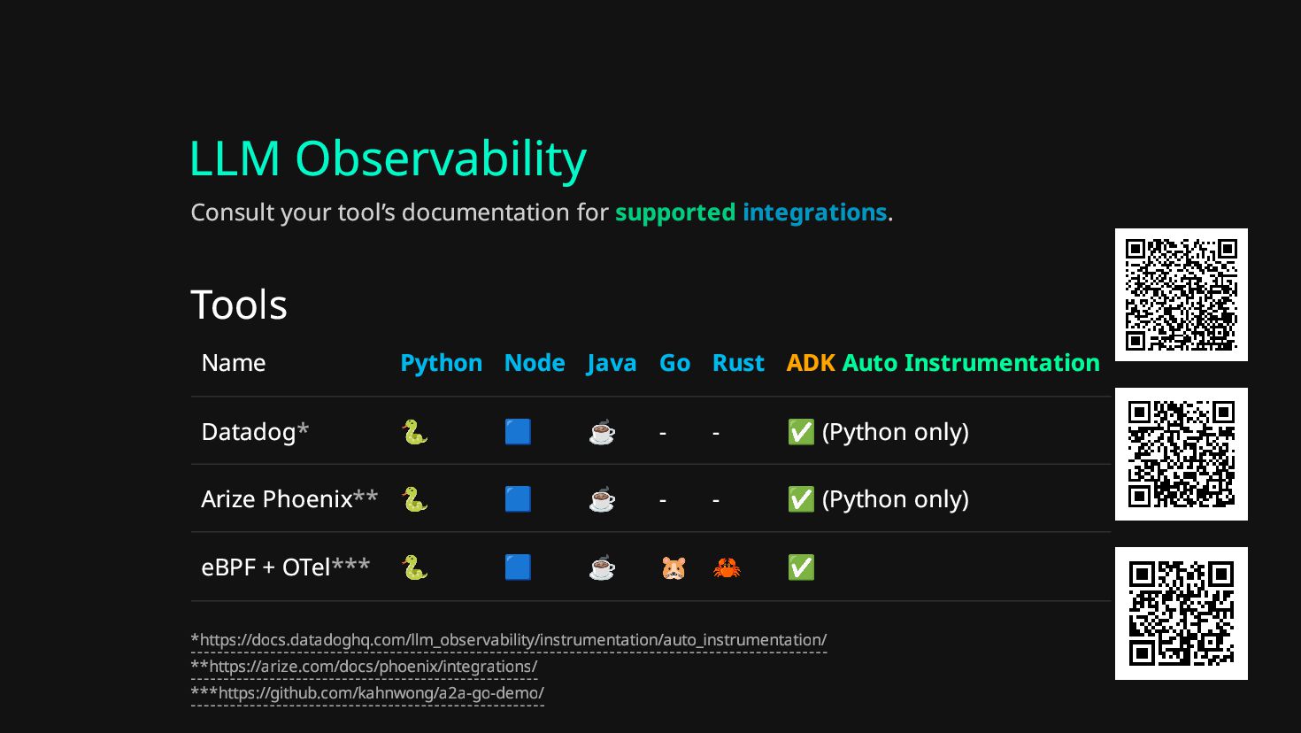 Auto Instrumentation Datadog* 🐍 🟦 ☕ - - ✅ (Python only) Arize Phoenix** 🐍 🟦 ☕ - - ✅ (Python only) eBPF + OTel*** 🐍 🟦 ☕ 🐹 🦀 ✅ Consult your tool’s documentation for supported integrations. *https://docs.datadoghq.com/llm_observability/instrumentation/auto_instrumentation/ **https://arize.com/docs/phoenix/integrations/ ***https://github.com/kahnwong/a2a-go-demo/