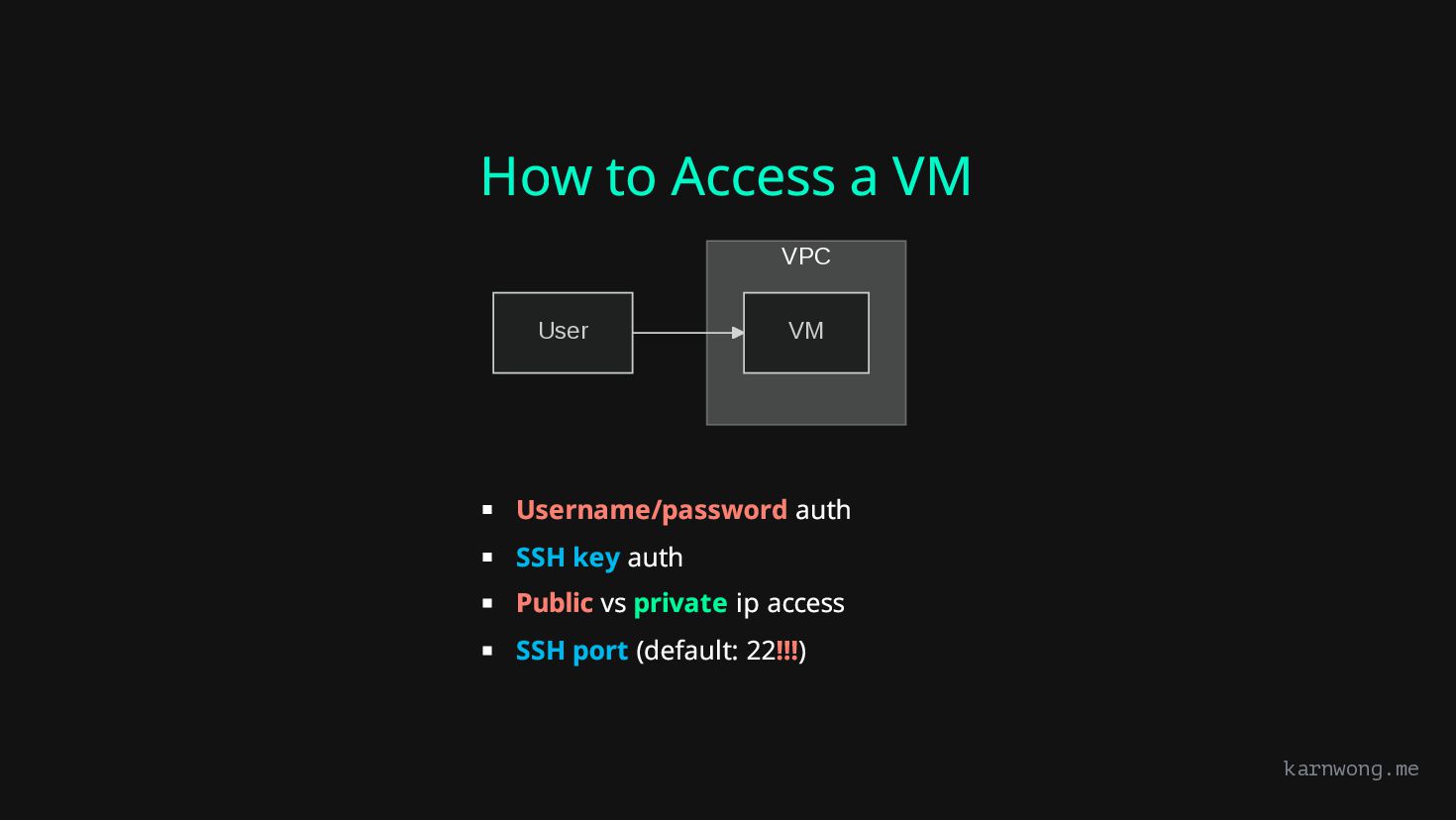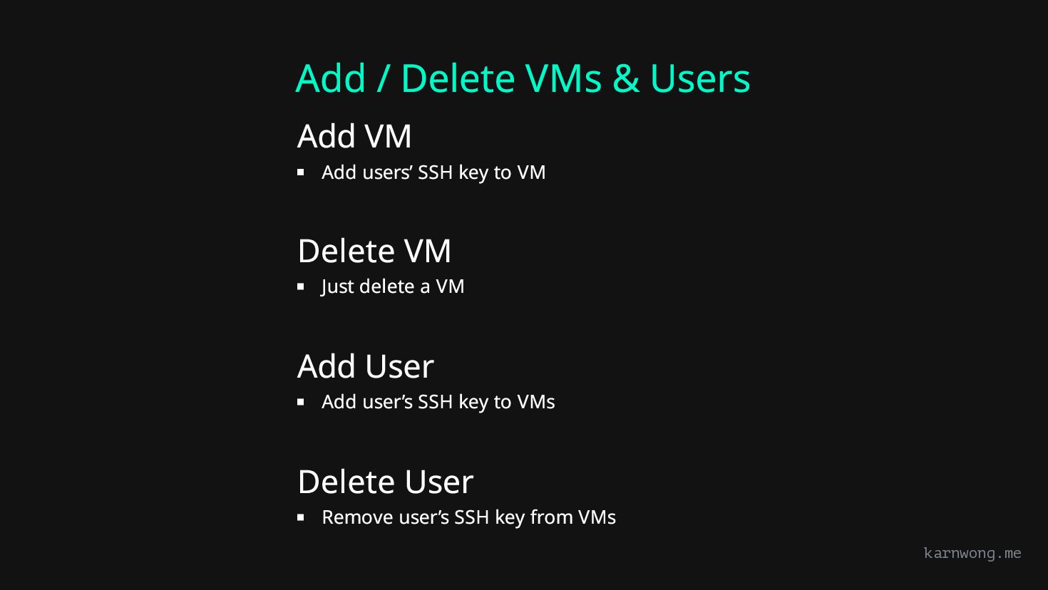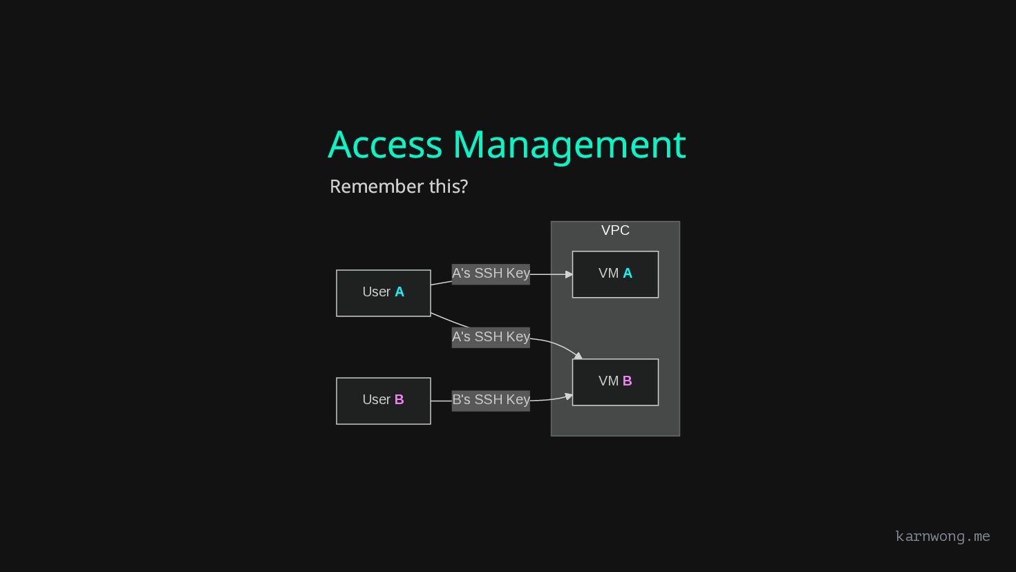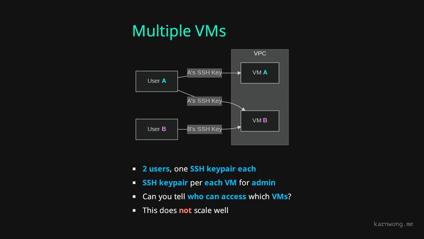 B's SSH Key VM A VM B User A User B 2 users, one SSH keypair each SSH keypair per each VM for admin Can you tell who can access which VMs? This does not scale well
