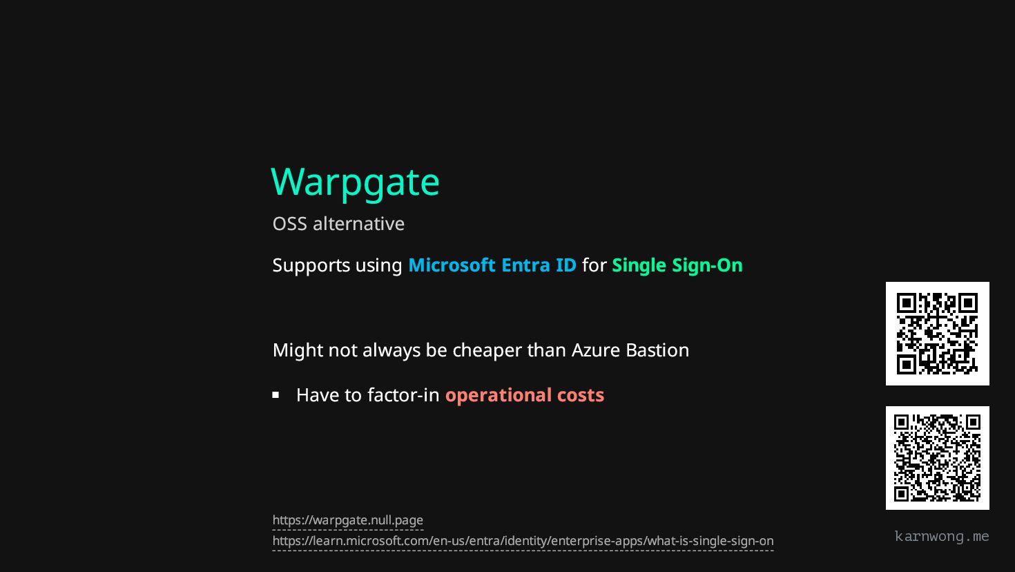Might not always be cheaper than Azure Bastion Have to factor-in operational costs OSS alternative https://warpgate.null.page https://learn.microsoft.com/en-us/entra/identity/enterprise-apps/what-is-single-sign-on