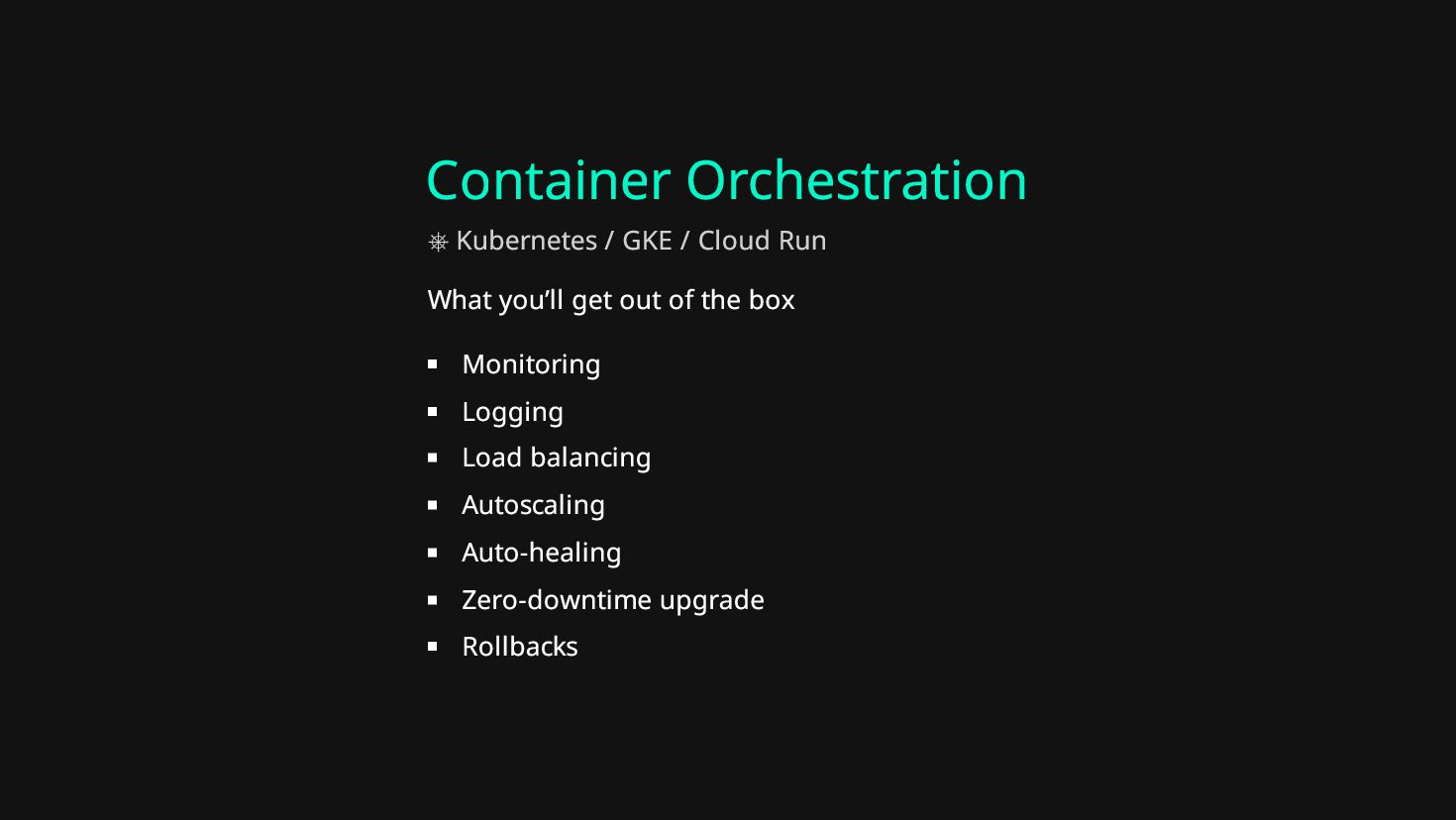 Logging Load balancing Autoscaling Auto-healing Zero-downtime upgrade Rollbacks ⎈ Kubernetes / GKE / Cloud Run