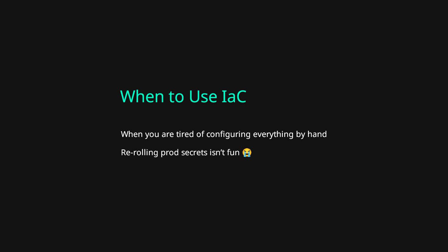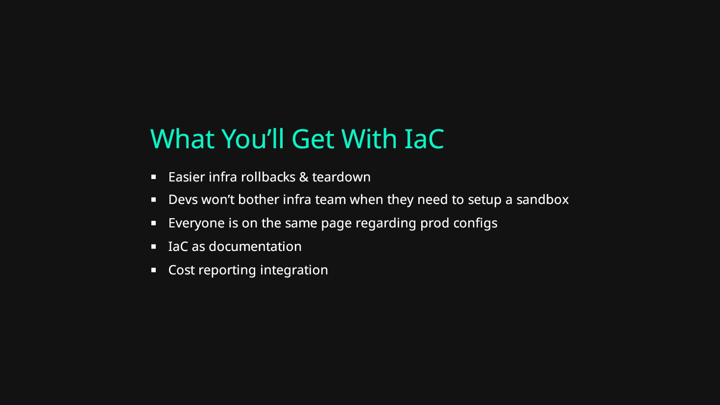 Devs won’t bother infra team when they need to setup a sandbox Everyone is on the same page regarding prod configs IaC as documentation Cost reporting integration
