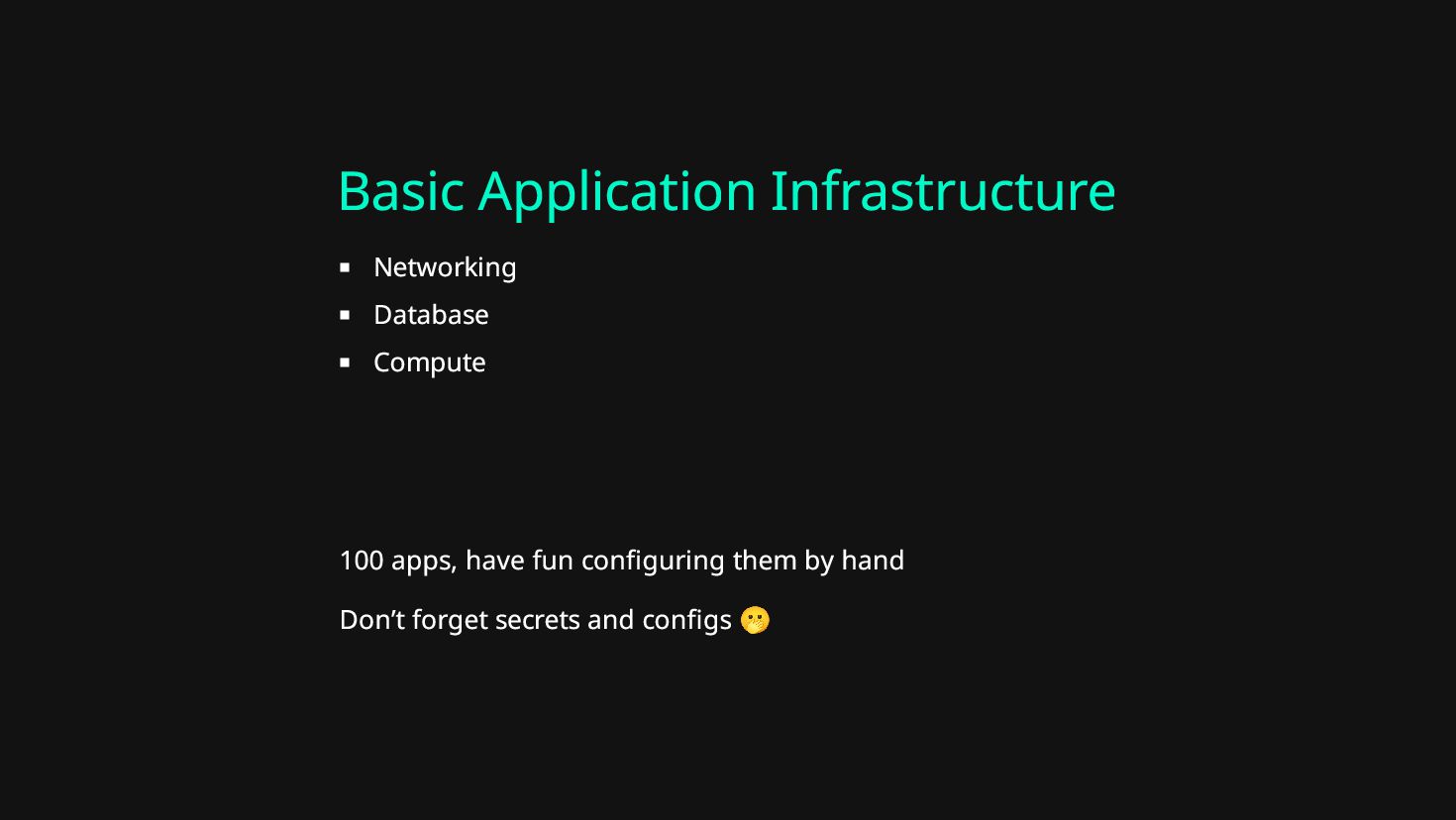 Basic Application Infrastructure Networking Database Compute 100 apps, have fun