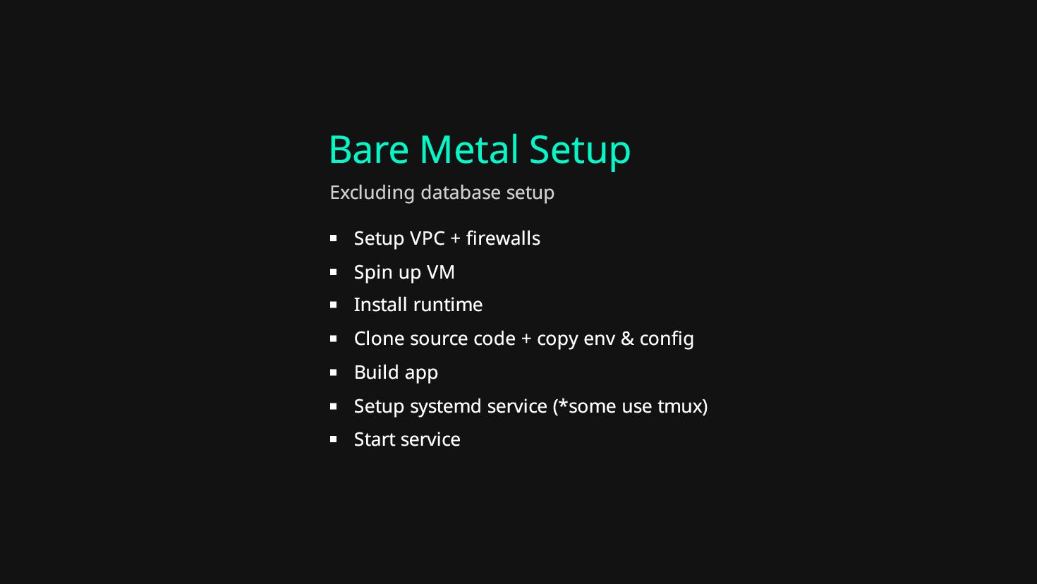 Install runtime Clone source code + copy env & config Build app Setup systemd service (*some use tmux) Start service Excluding database setup