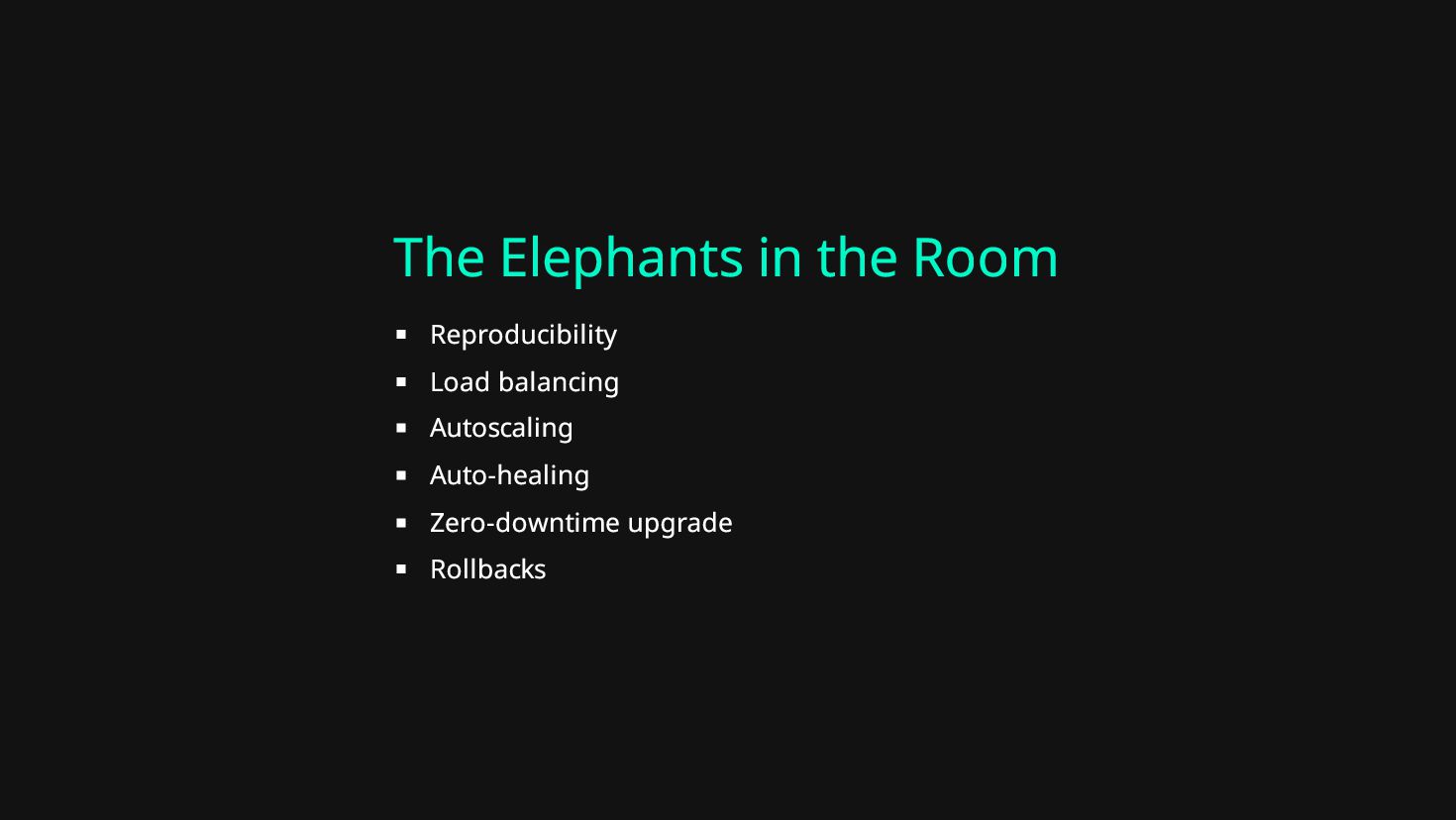 The Elephants in the Room Reproducibility Load balancing Autoscaling Auto-healing