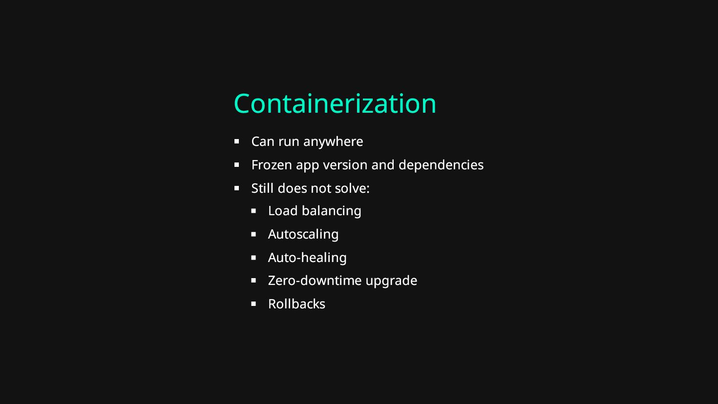 does not solve: Load balancing Autoscaling Auto-healing Zero-downtime upgrade Rollbacks