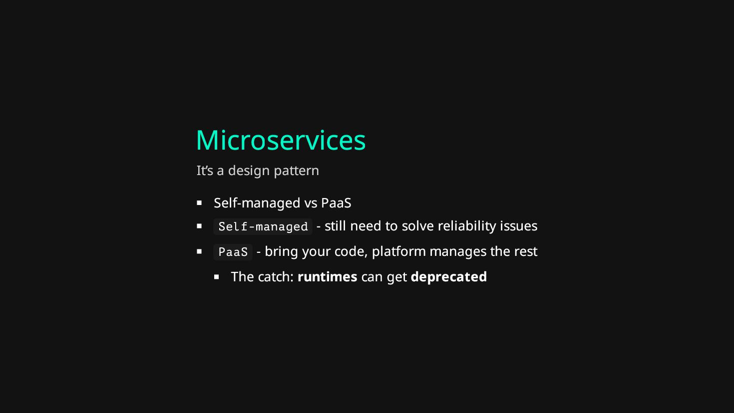 reliability issues PaaS - bring your code, platform manages the rest The catch: runtimes can get deprecated It’s a design pattern