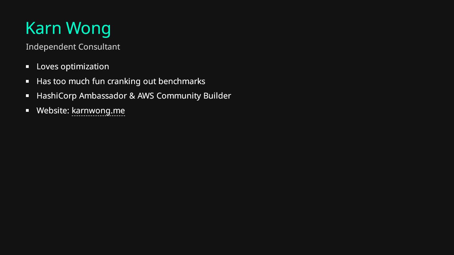 benchmarks HashiCorp Ambassador & AWS Community Builder Website: karnwong.me Independent Consultant