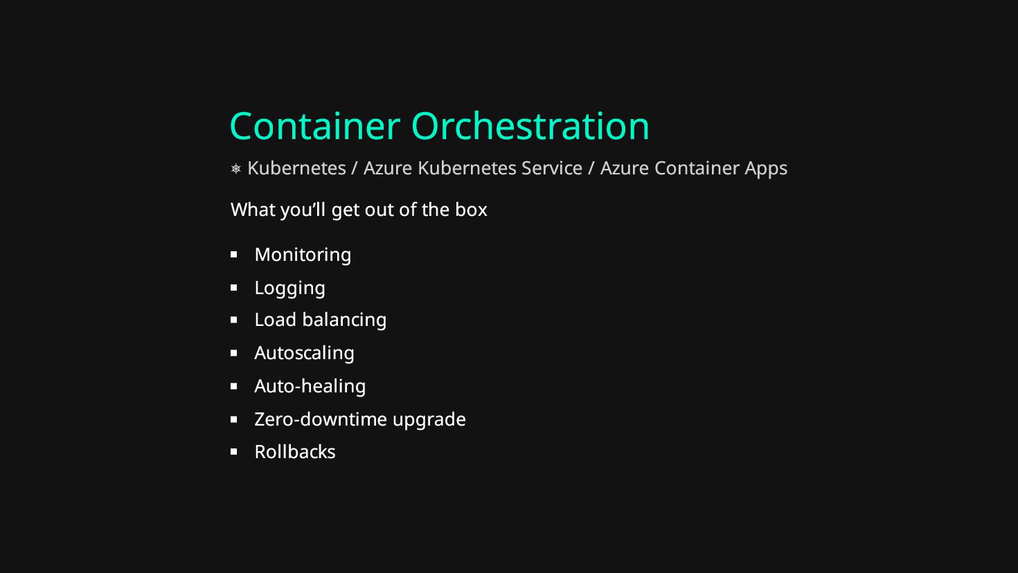 Logging Load balancing Autoscaling Auto-healing Zero-downtime upgrade Rollbacks ⎈ Kubernetes / Azure Kubernetes Service / Azure Container Apps