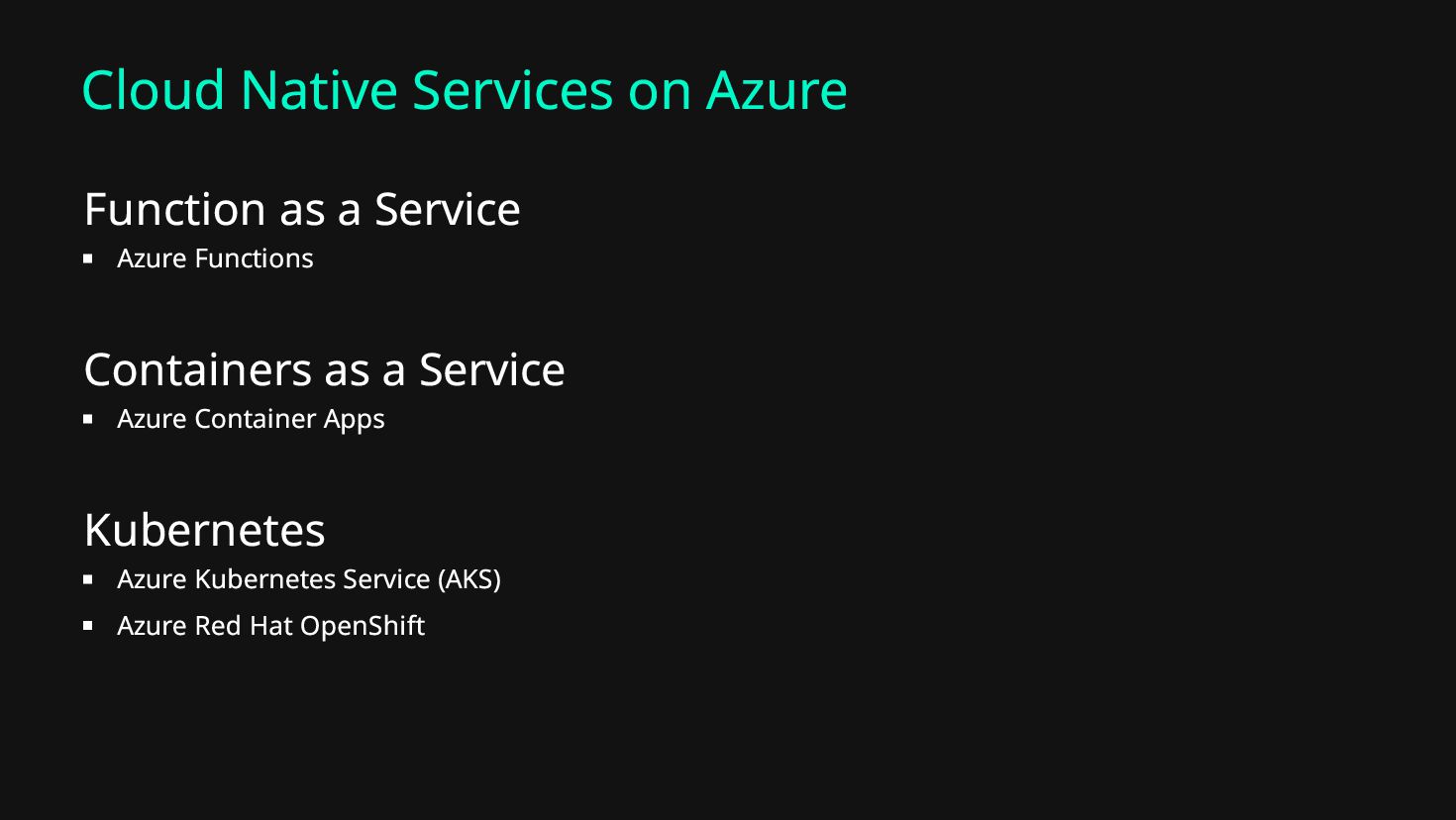 Functions Containers as a Service Azure Container Apps Kubernetes Azure Kubernetes Service (AKS) Azure Red Hat OpenShift